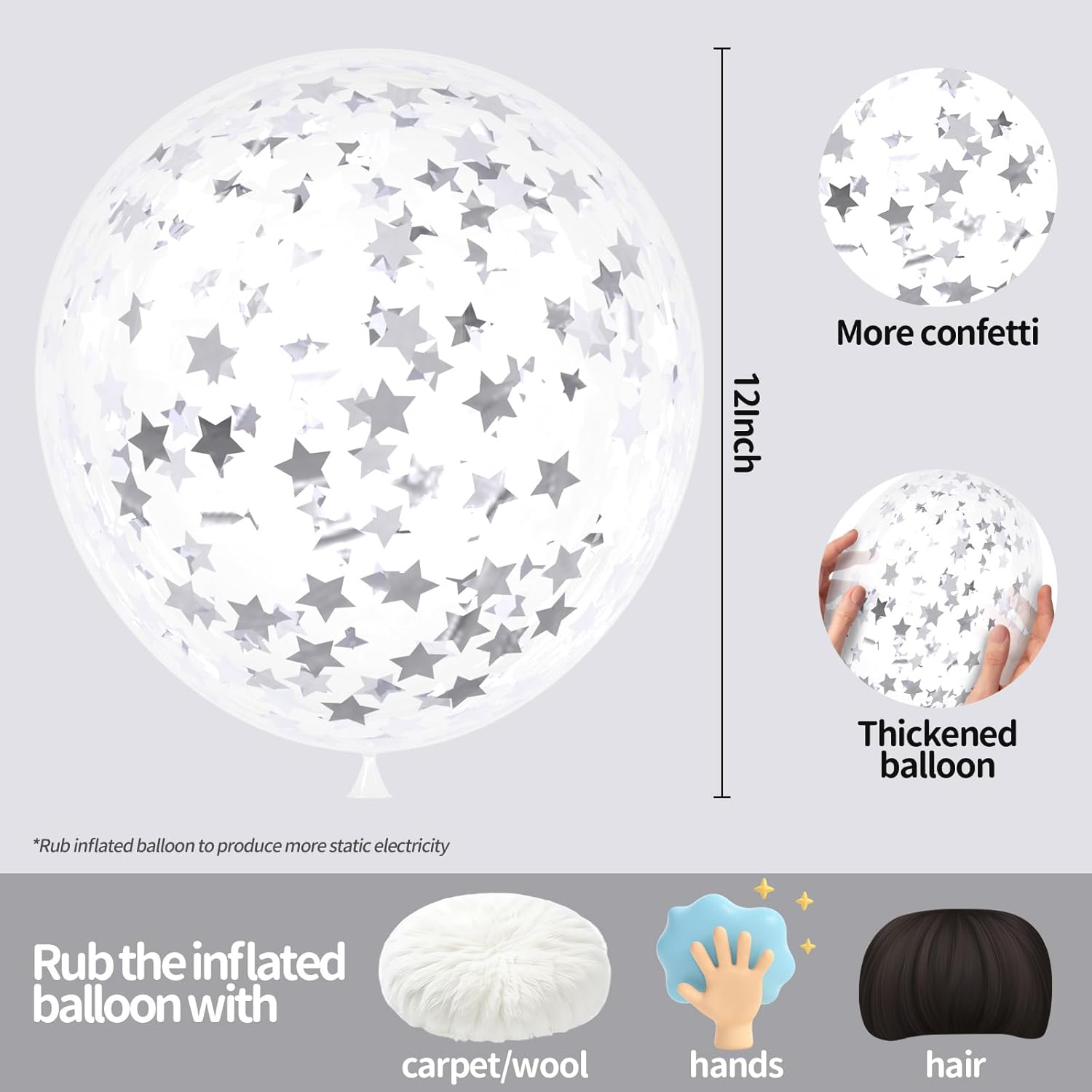 - How to Use: After inflating the balloon, rub the balloon repeatedly with your hand, static fabrics or hair, the static electricity will be evenly distributed inside the balloon, which will help the confetti stick to the balloon