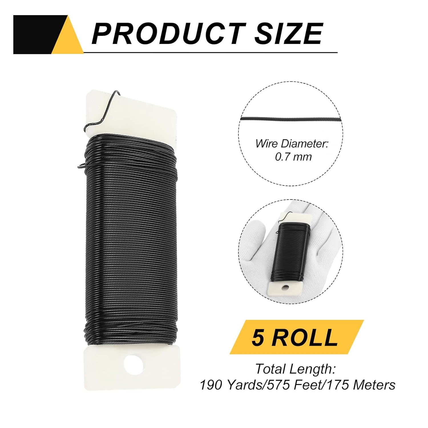- Color: Black; Material: Aluminum; Total Length: 190 Yards/575 Feet/175 Meters; Diameter: 0.7mm/21 Gauge; In the package of: 5 Roll Metal Floral Wire (38 Yards/ Roll)
