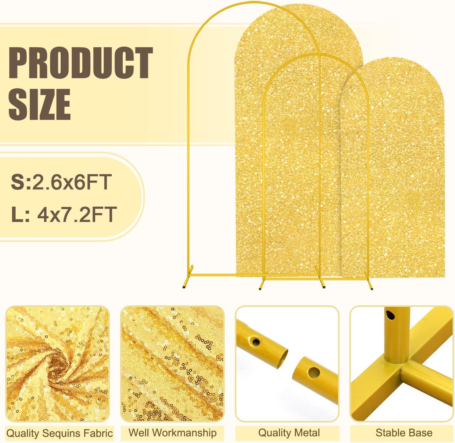 - ⭐Size Guide - Arch Backdrop Stand and Cover Set: The size of arch backdrop stand set about are 2.6FTx6FT(W x H), 4FTx7.2FT(W x H) with gold arch cover set. Metal arch backdrop stand set add a graceful and striking look for your party or event.