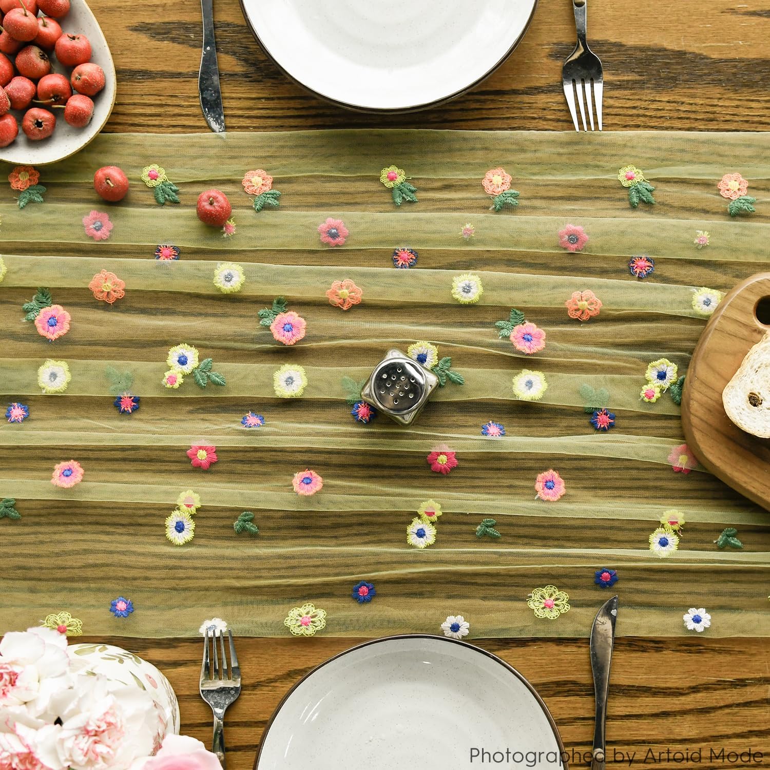 Artoid Mode Green Embroidery Daisy Gauze Table Runner 120 Inch 10FT, Seasonal Sheer Kitchen Dining Holiday Wedding Birthday Table Decor for Home Party