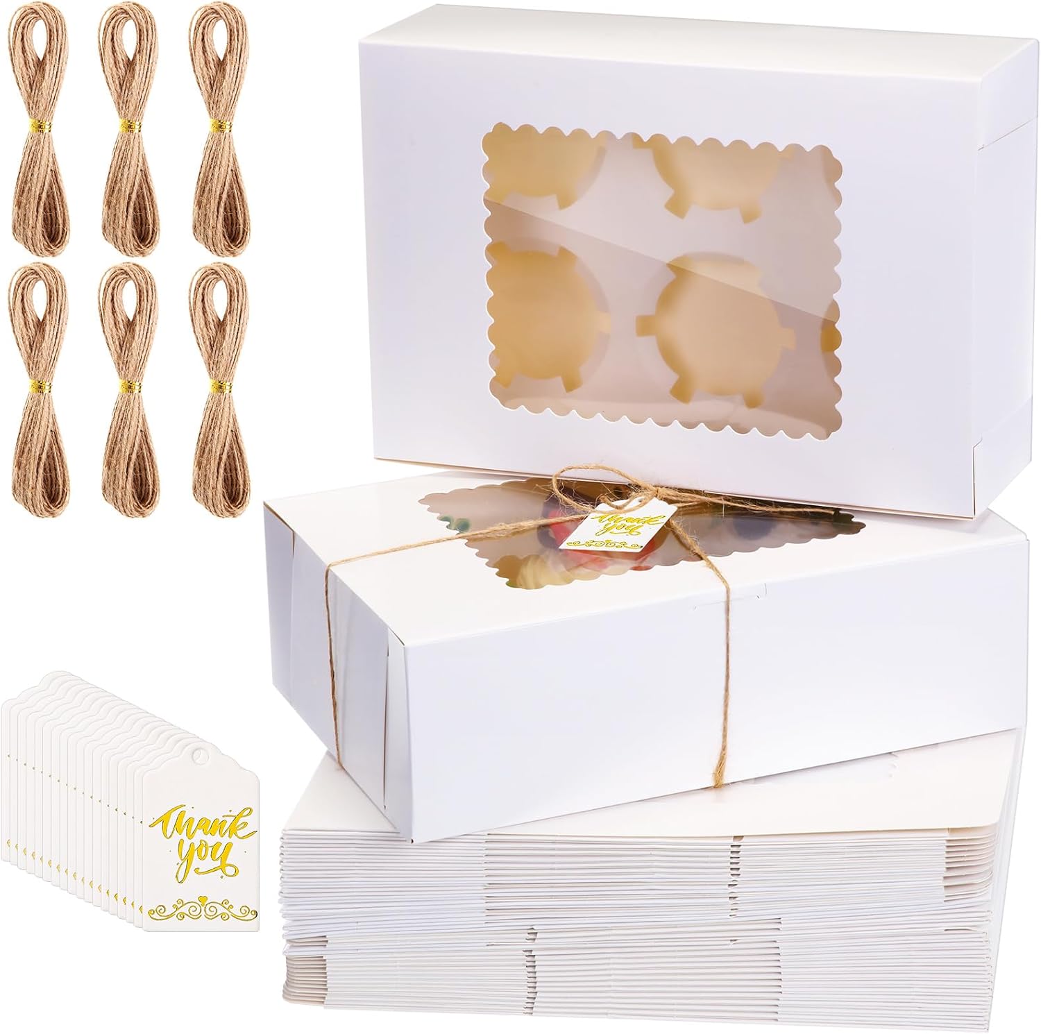 - Value Cupcake Boxes: you will receive 36 white cupcake boxes with windows and inserts; Each cupcake holder can hold 6 standard cupcakes, and comes with 6 jute ropes totaling 60 meters (6 rolls X 10 meters) and 36 "Thank You" cards, which can ideal display your baking works and gift-giving needs