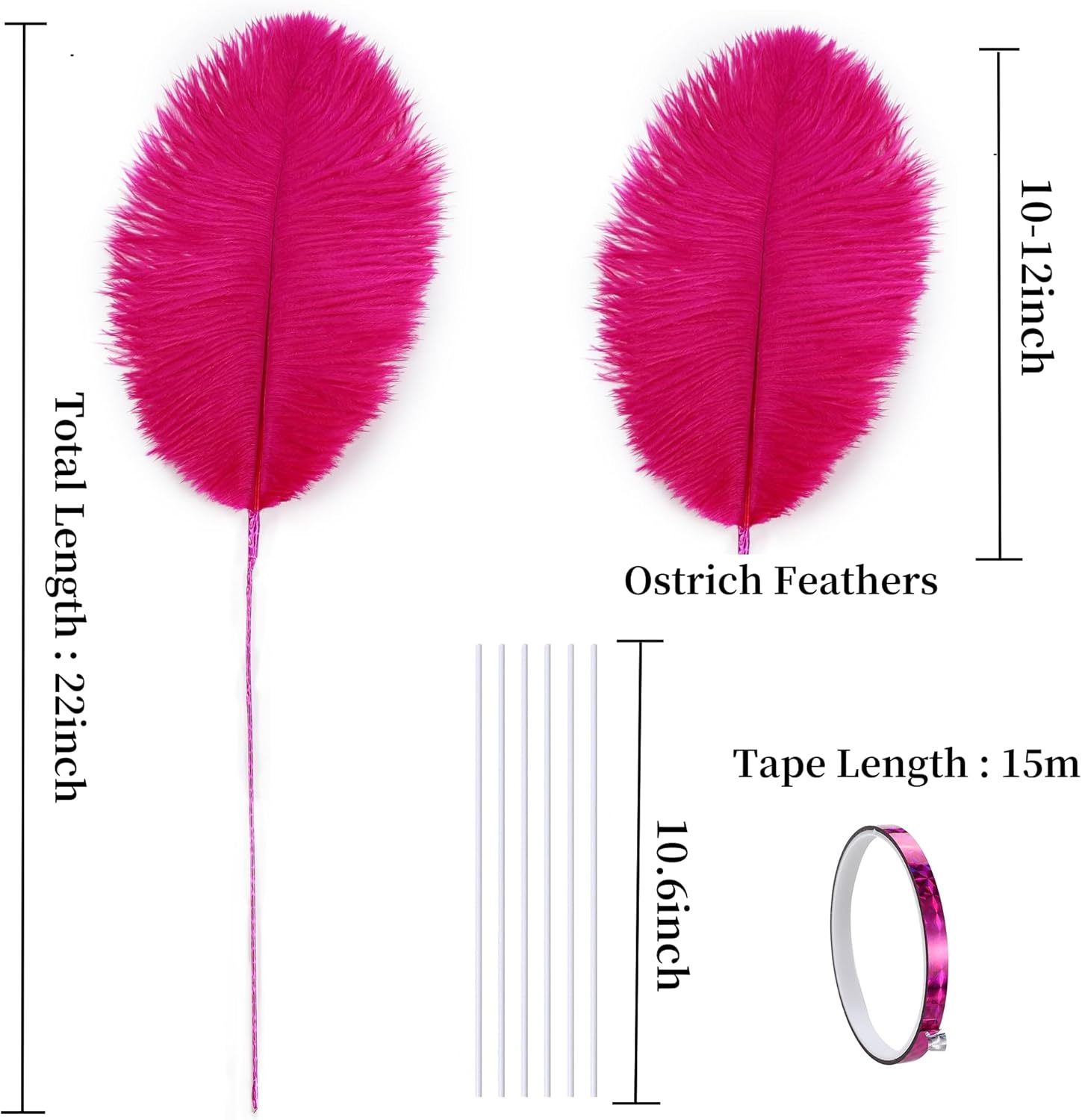 - 22inch Ostrich Feathrs Kit: 20pcs 10-12 inches hot pink ostrich feathers, 20 pcs 10 inches long iron wire, and a 15m tape in the same color with the feather. Rich set content to meet your decoration and use needs