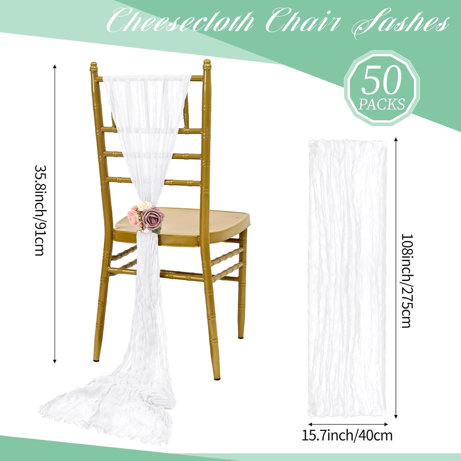 - 【Package Include】You will get 50 pack White cheesecloth chair sashes, they measure about 40 x 275 cm/ 15.7 x 108 inches.enough quantity can meet your wedding decoration and replacement needs, suitable for wedding banquets and various parties.