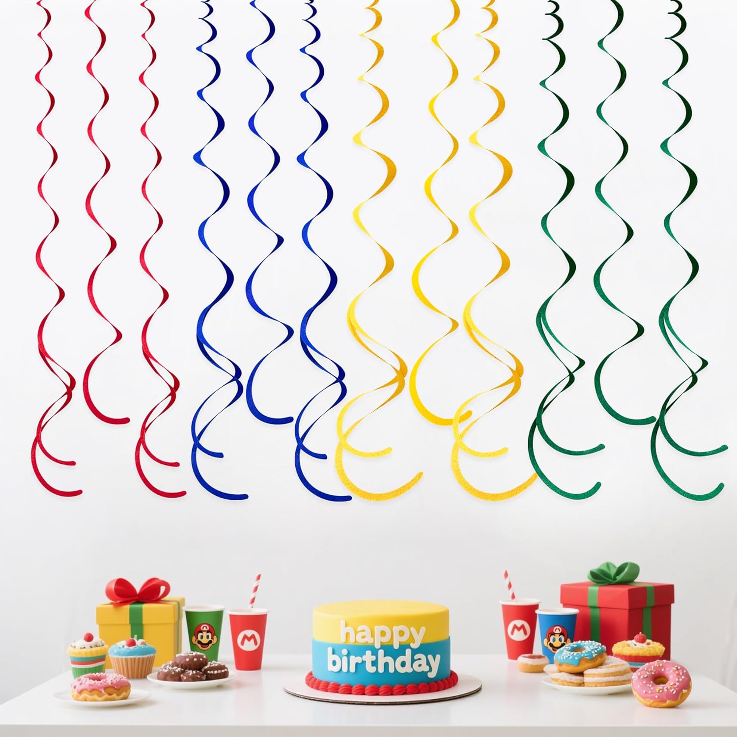 - Package Contains - 36 packs of mario color swirl party streamer,Each swirl can extends to approximately about 2.62 feet long,Meeting daily general needs.Comes with 40 plastic hooks for hanging.
