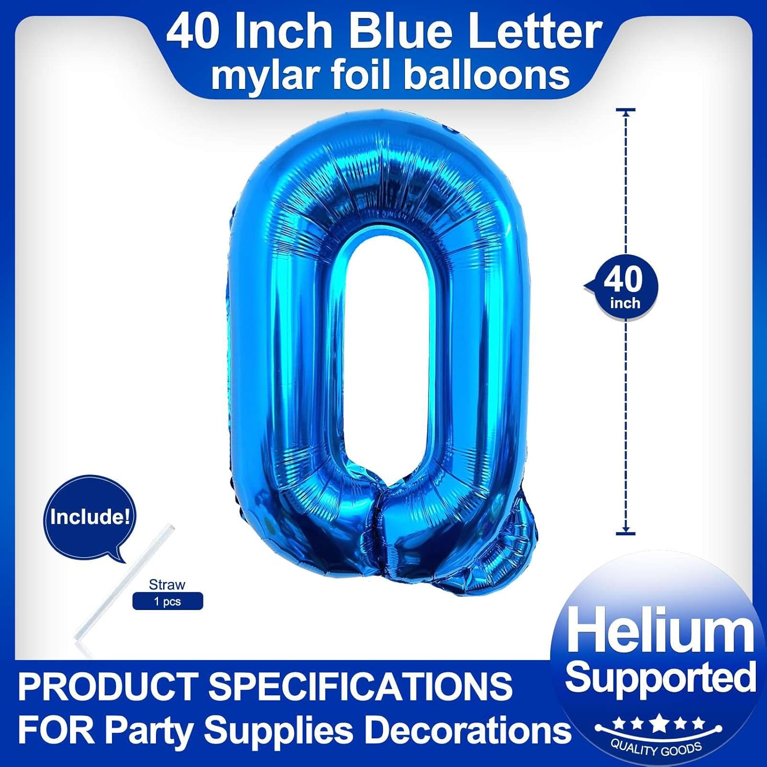 - Package included:One Blue Letter Q Balloon*1,straw*1,40 inch Blue letter balloon