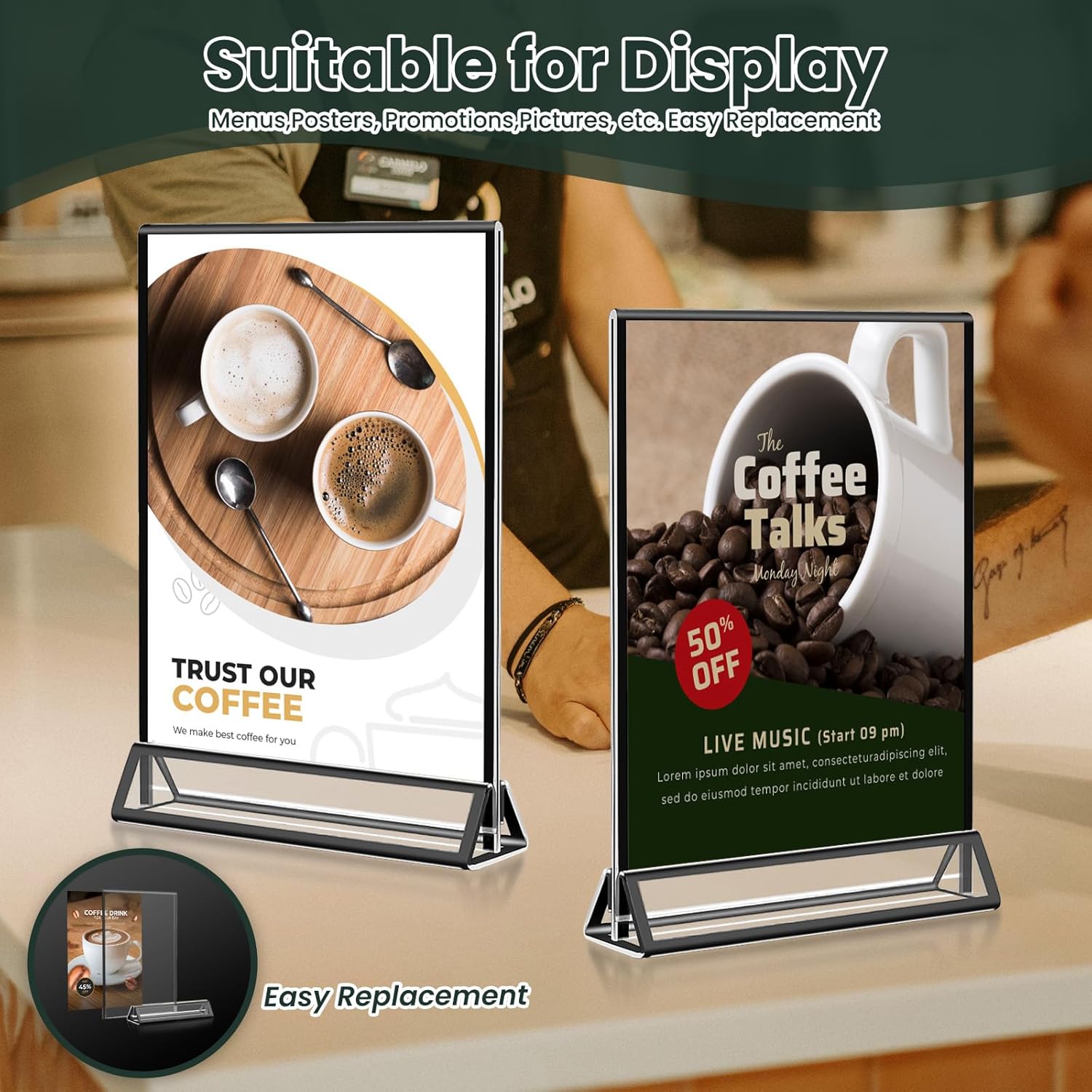 - 【Easy to Assemble】Only 3 steps to get the acrylic stand ready for use, firstly tear off the protective film on the acrylic blackblack frame, adopt the triangular groove base for better inserting the table sign or anything you want to display. At last, push the frame into the base. And if you want to store them, you can just separate the frame and base and put them into a box without any hassle.