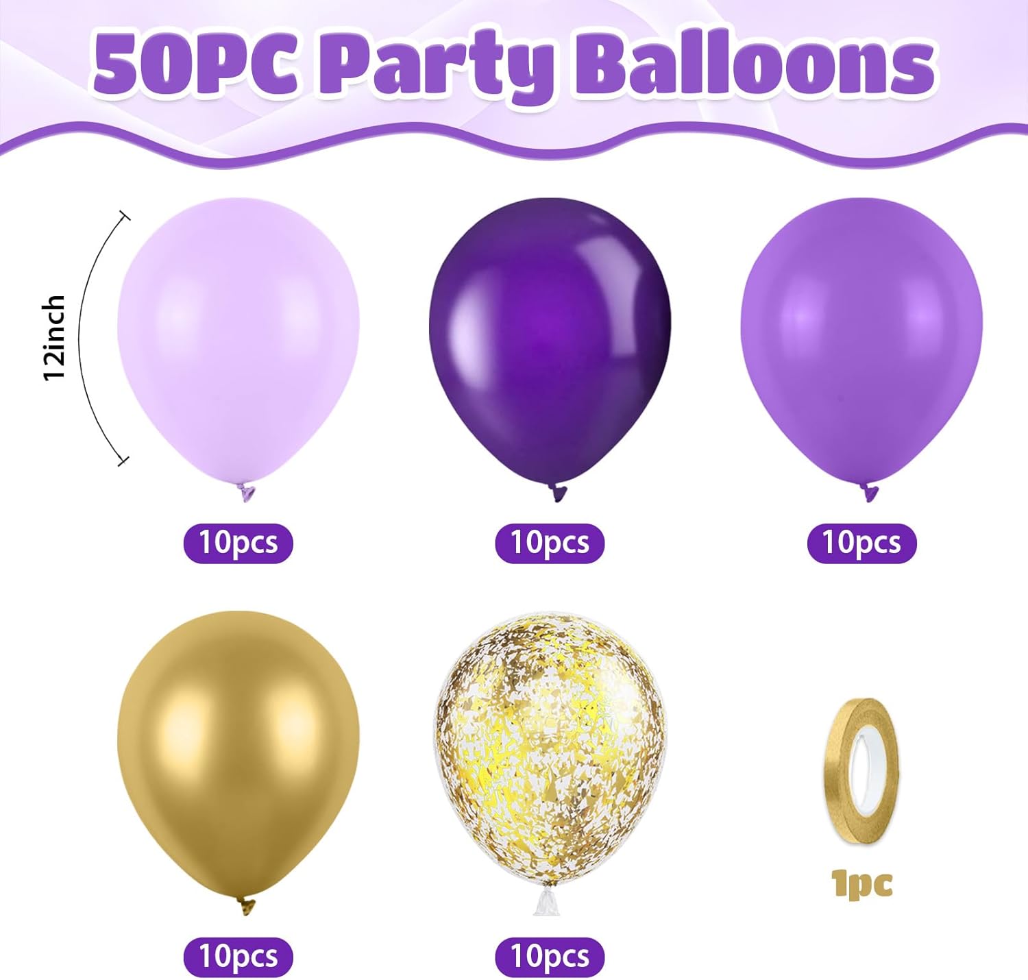 - Purple and Gold Balloons Set: 10pcs macaron purple balloons, 10pcs black purple balloons, 10 matte purple balloons, 10pcs metallic gold balloons, 10pcs gold confetti balloons, 1pc gold ribbon in our party balloons set. These decorations effortlessly elevate any event—no need to overthink your party setup. It’s all about creating a playful and elegant vibe.