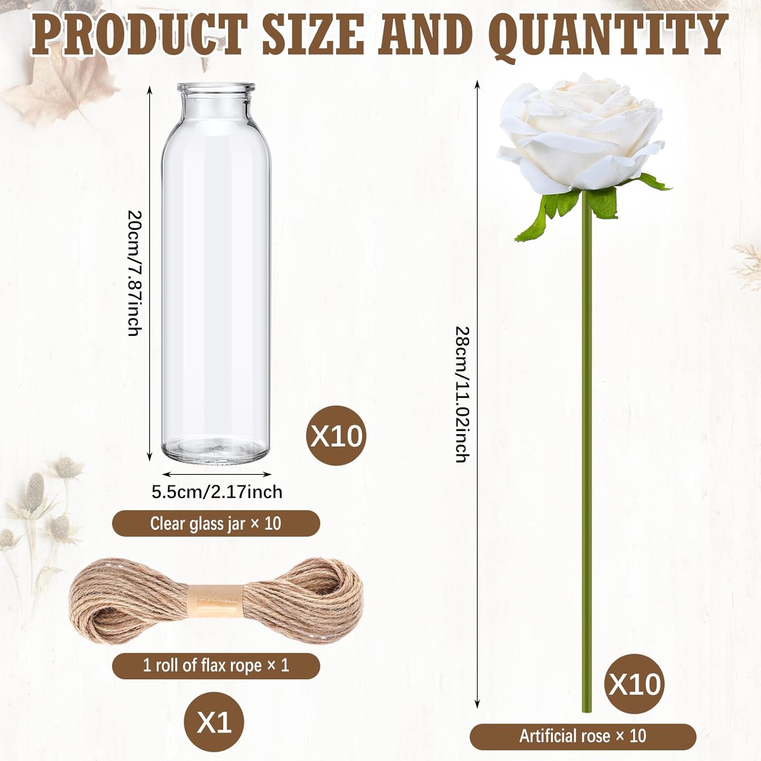10 Set Dried Pampas Grass Centerpiece for Wedding 10 Clear Glass Jars 10 Artificial Roses 80 Dried Pampas Grass with Rope for Baby Shower Rustic Bridal Party Farmhouse Decoration (White)