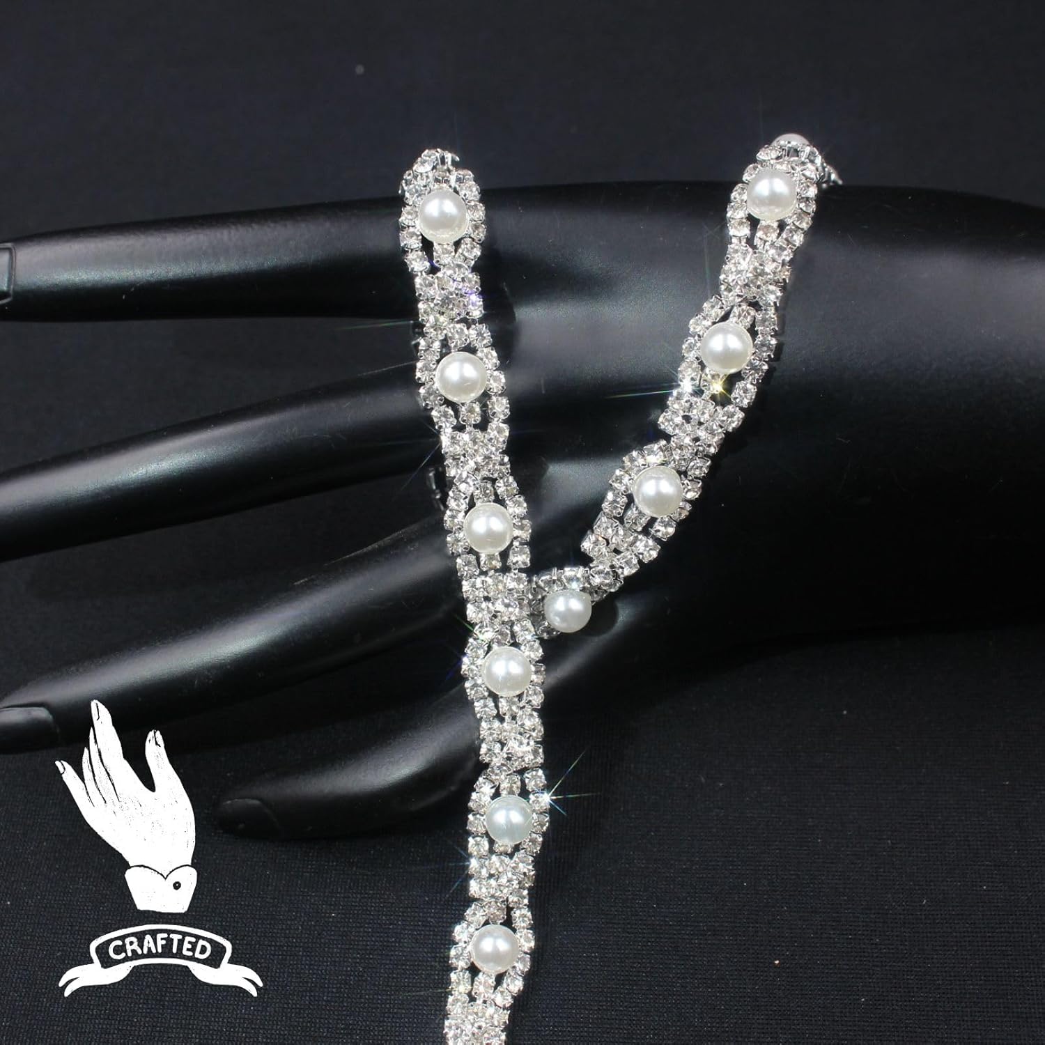 PEARLY JUN 2 Yards Pearl Rhinestone Trim Chain Silver Crystal Fringe Diamond Applique Ribbon String Tassel Strip for Sewing Wedding Dress Crafting Crafts Flower Embellishments