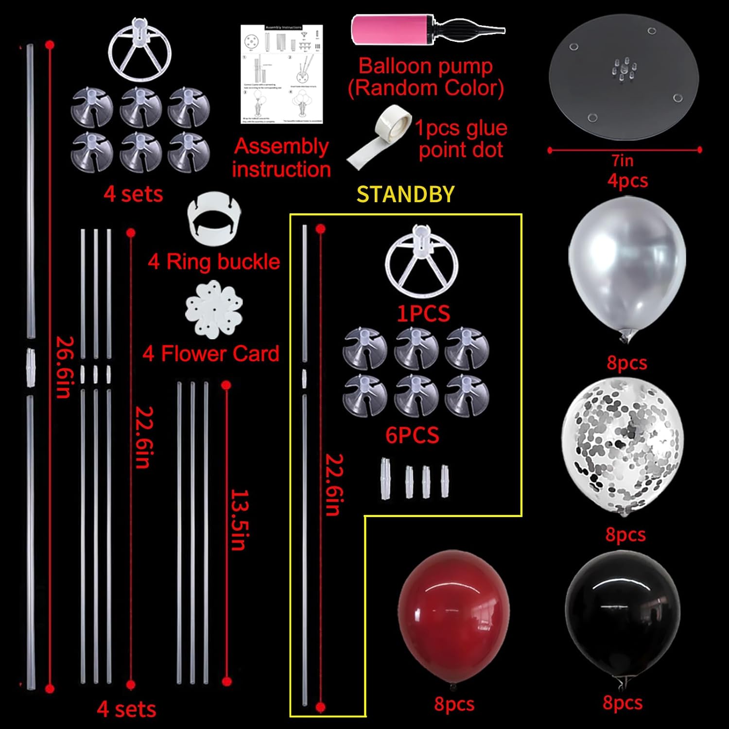 - Included Components : Balloon Stand, Burgundy Red Black Silver Balloons, Filling Pump, Glue, Tying Tool