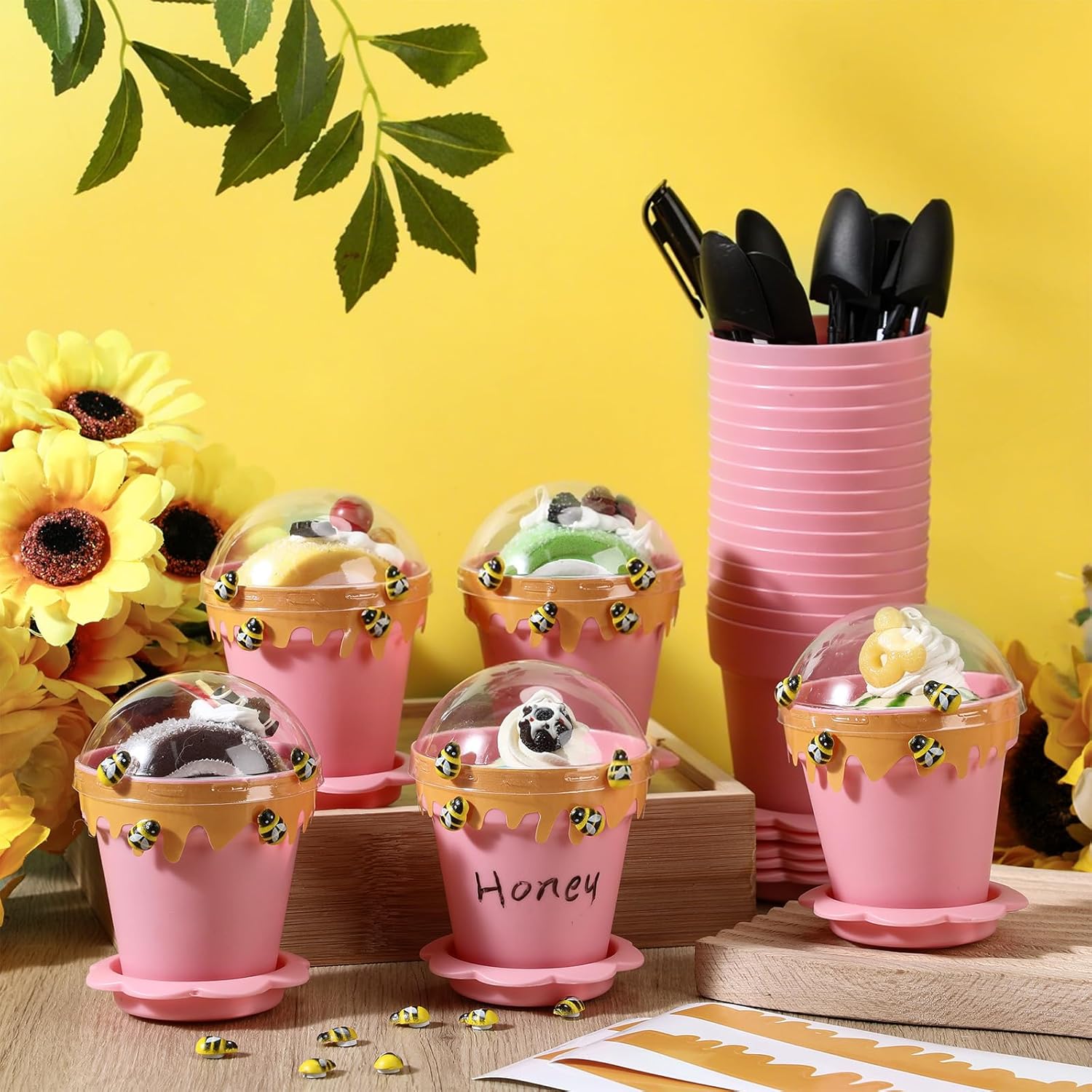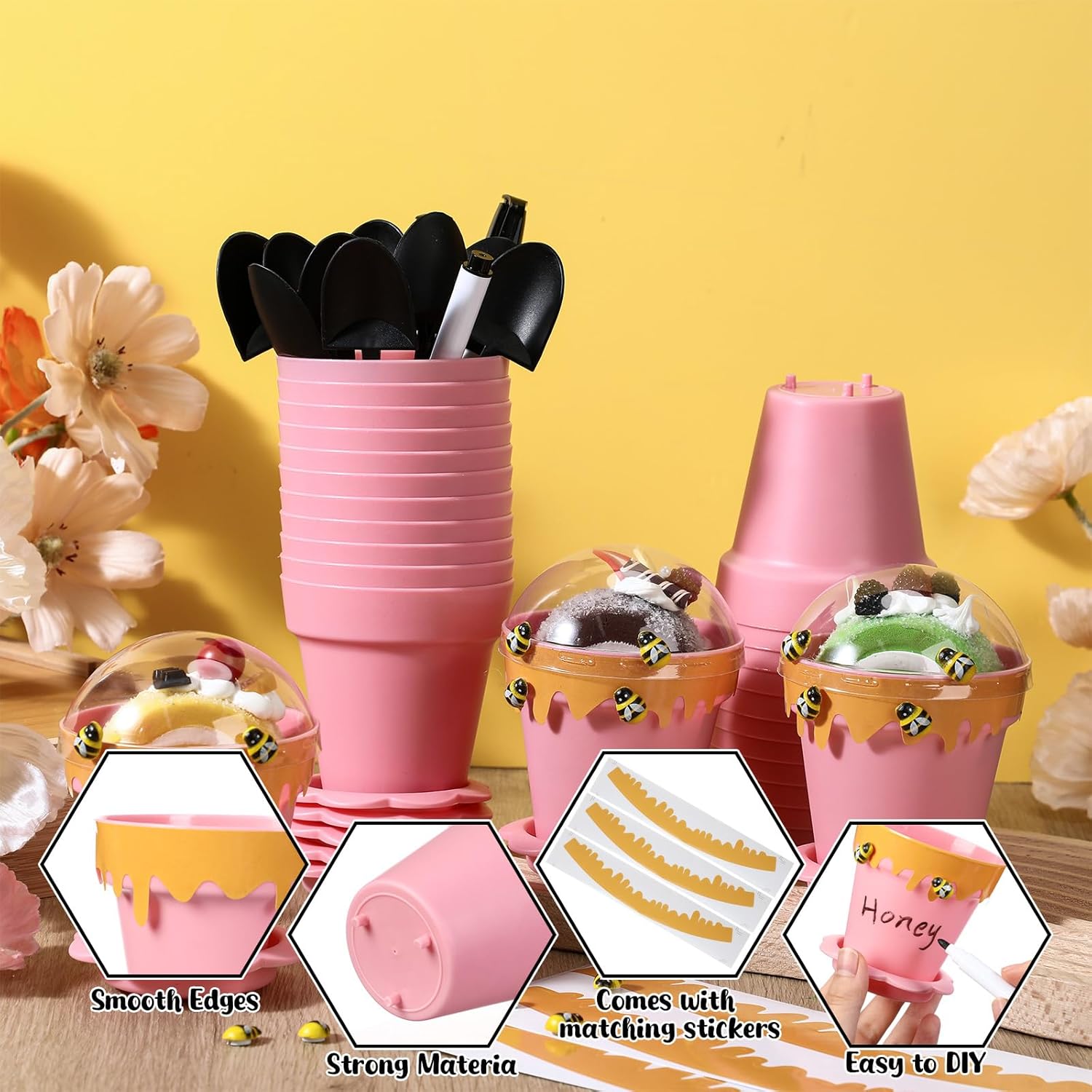 30 Sets Mini Honey Bee Pots with Lids, Spoon, Saucers and Bee Charms, 6.76 OZ Plastic Honey Jars for Cupcake Dessert Themed Party Favor Planter Baby Shower Birthday Wedding Decoration (Pink)