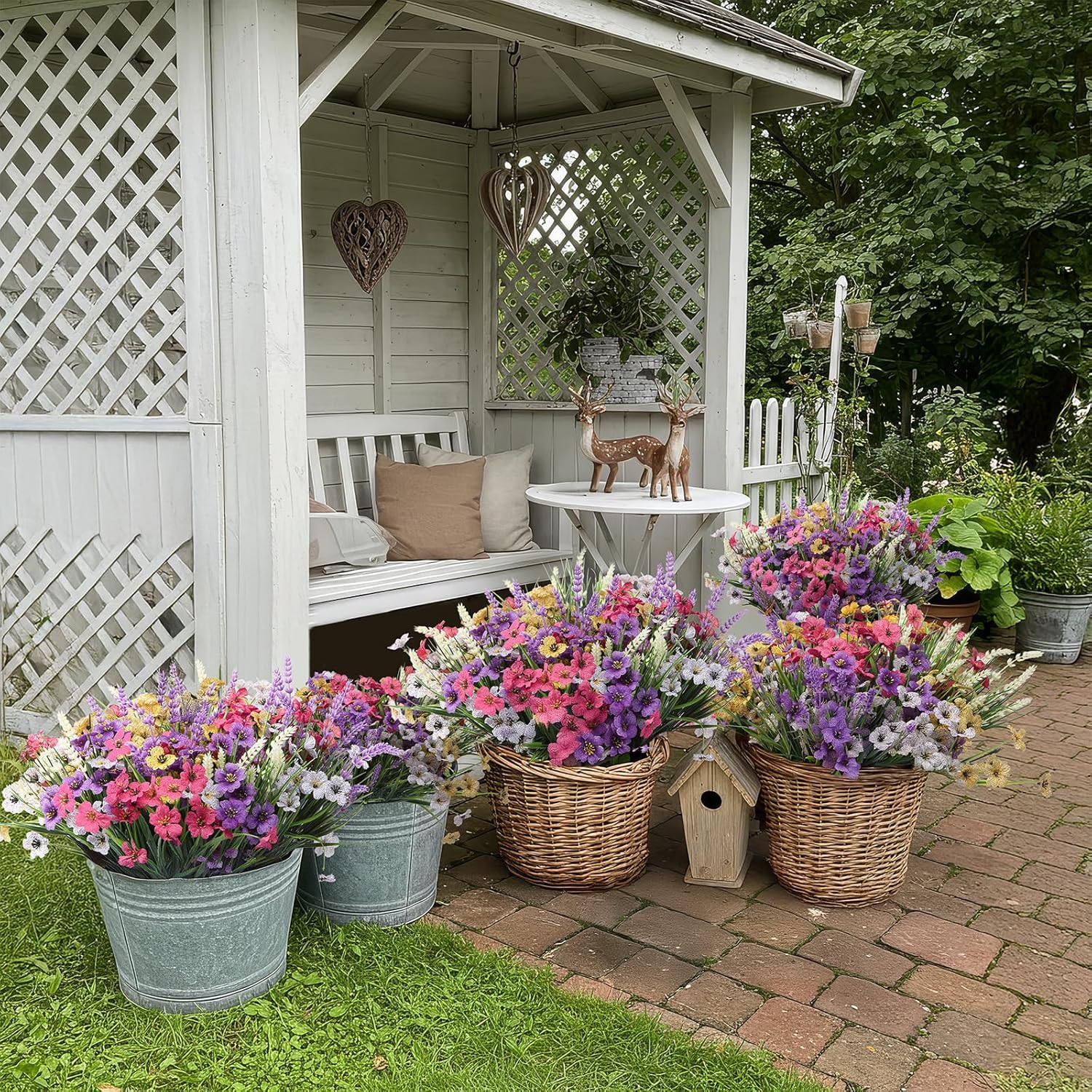- UV Resistant Outdoor Artifical Flowers: These fake flowers are made of UV-coated silk flowers and plastic eucalyptus leaves that can withstand sunlight and wind, maintain their brilliance