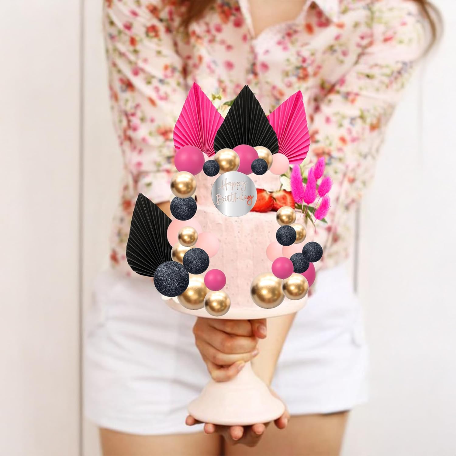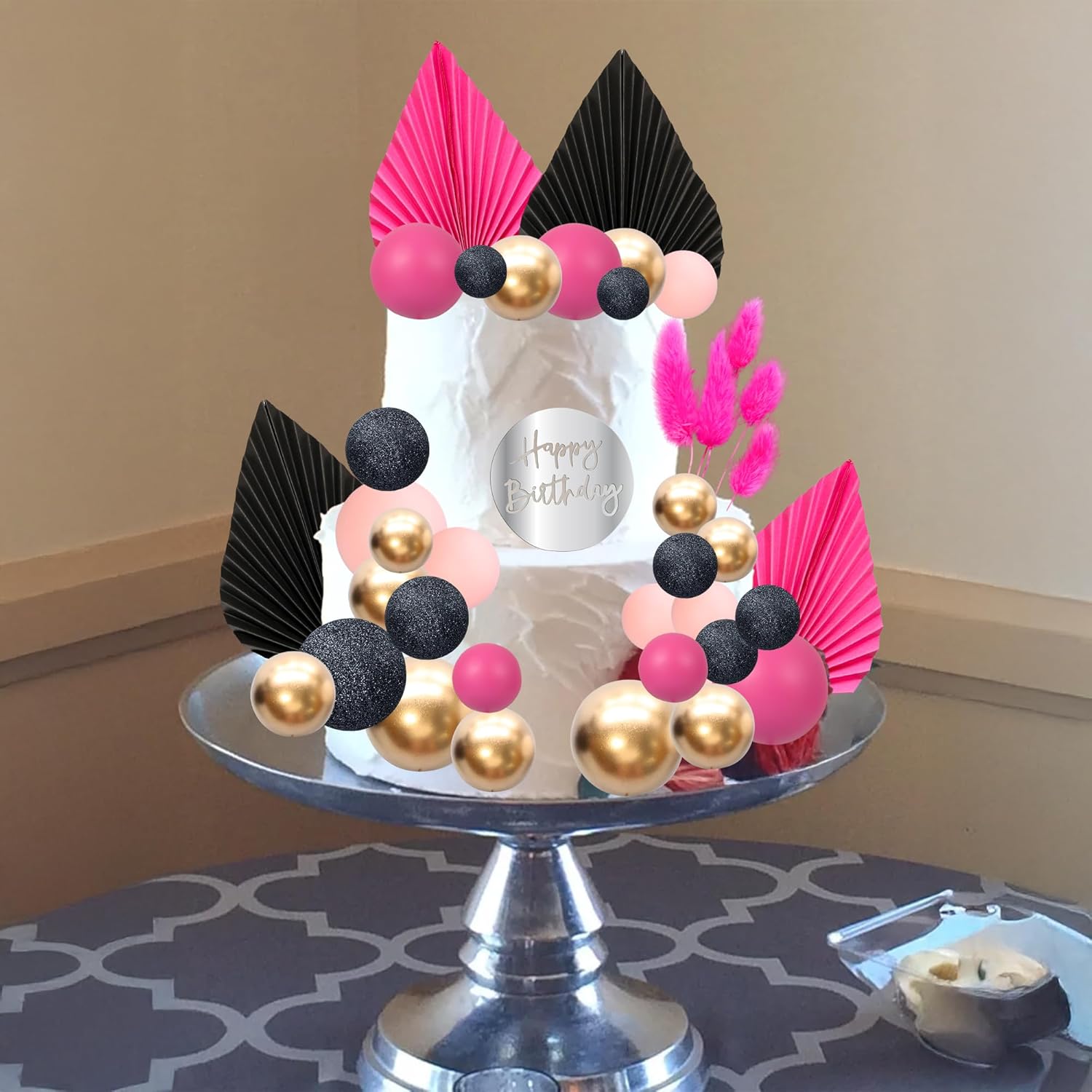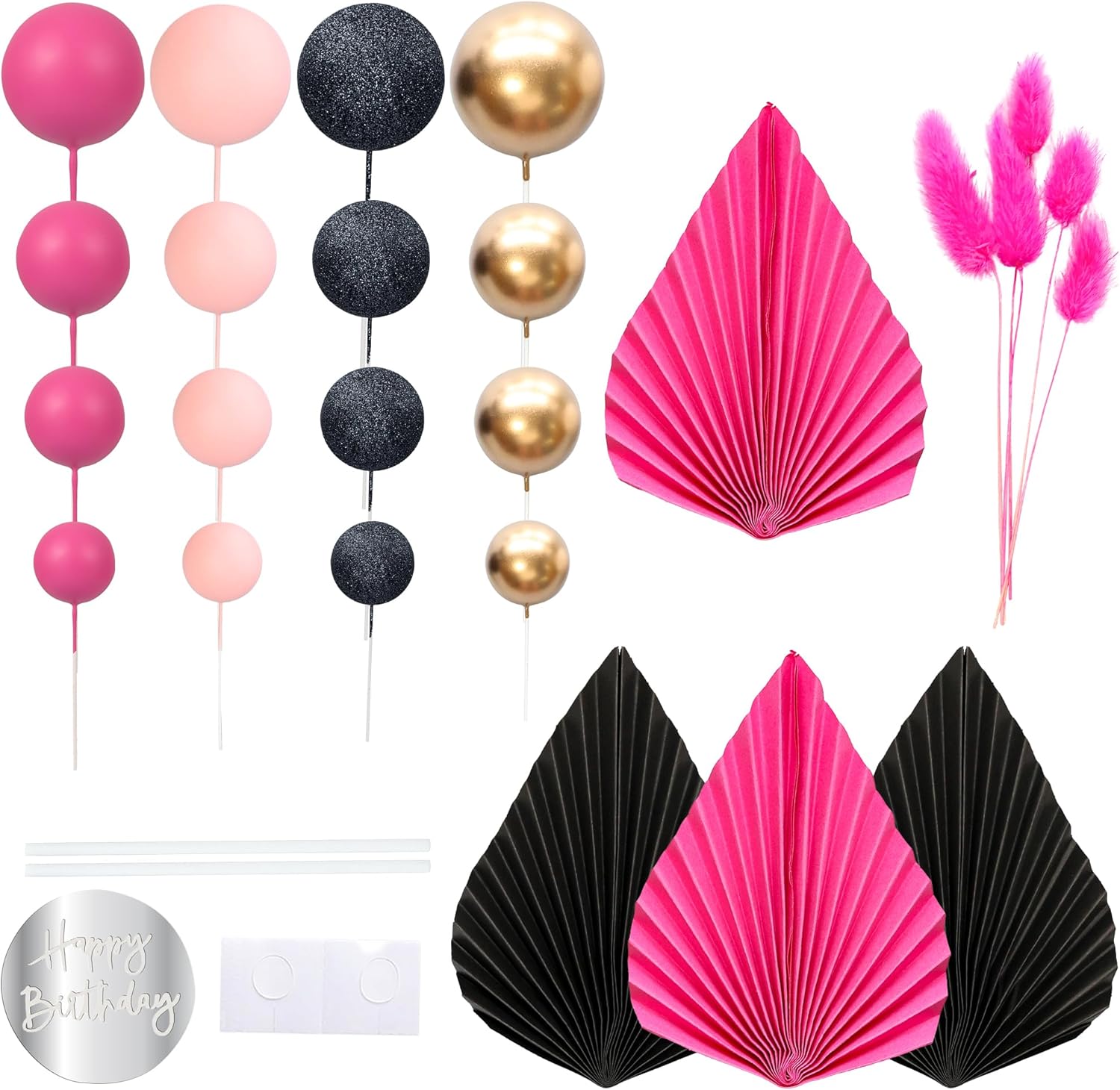Ephlyn 33 Pack Balls Cake Toppers Boho Palm Leaves Cake Decorations Round Acrylic Happy Birthday Cupcake Toppers for Birthday Wedding Baby Shower Party Supplies Pink Black