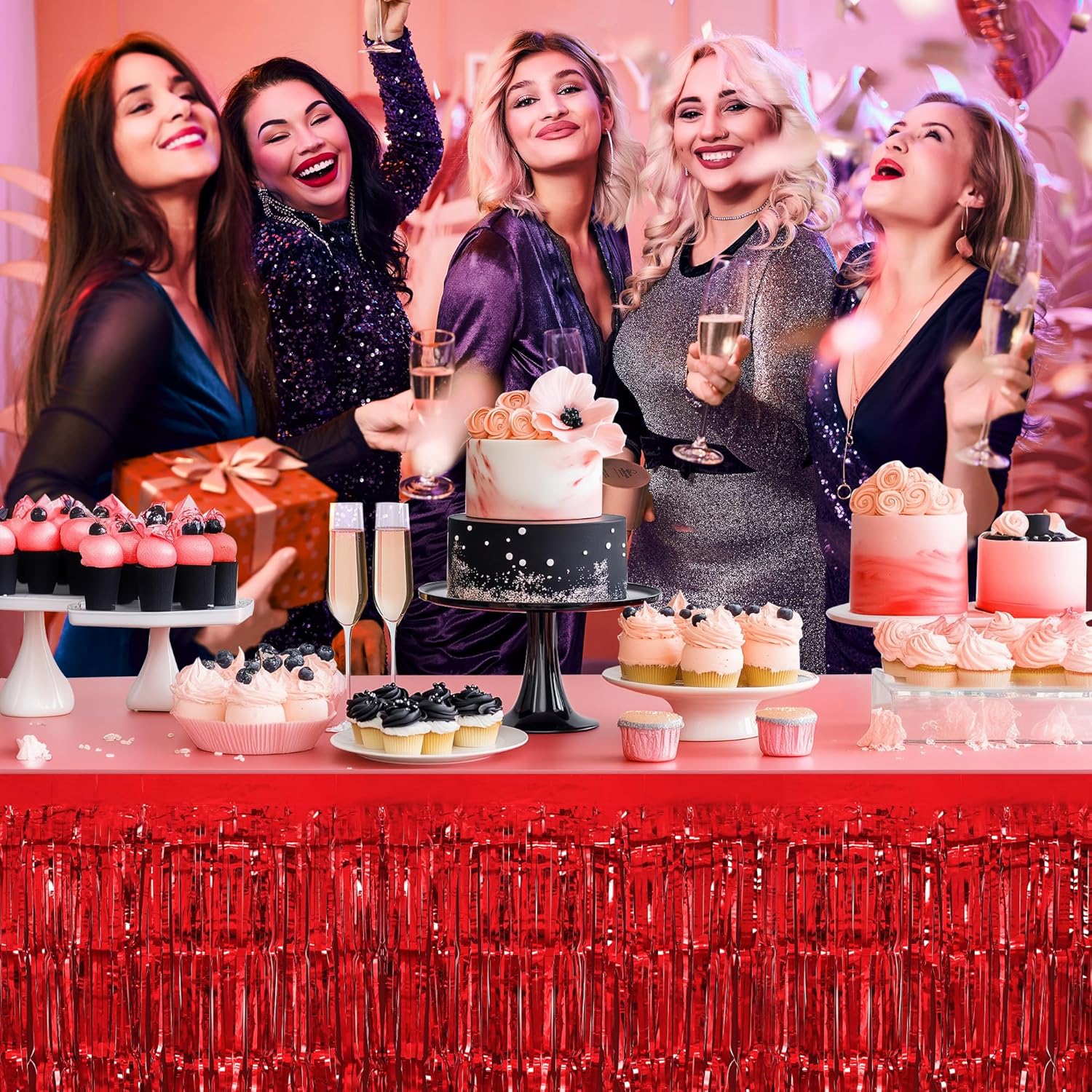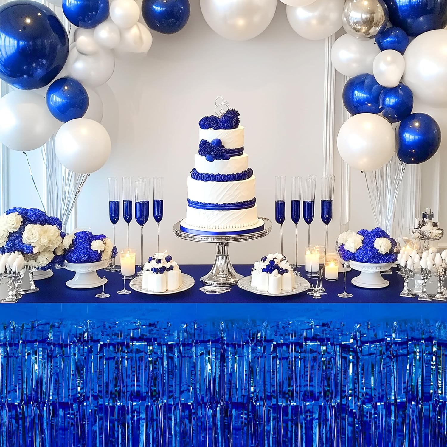 2 Pack Red Dark Blue Table Skirts, 29x108" Metallic Foil Tinsel Fringe Table Skirt for Rectangle Tables Streamer Curtains Backdrop, Party Decorations for Birthdays, Weddings, Holidays
