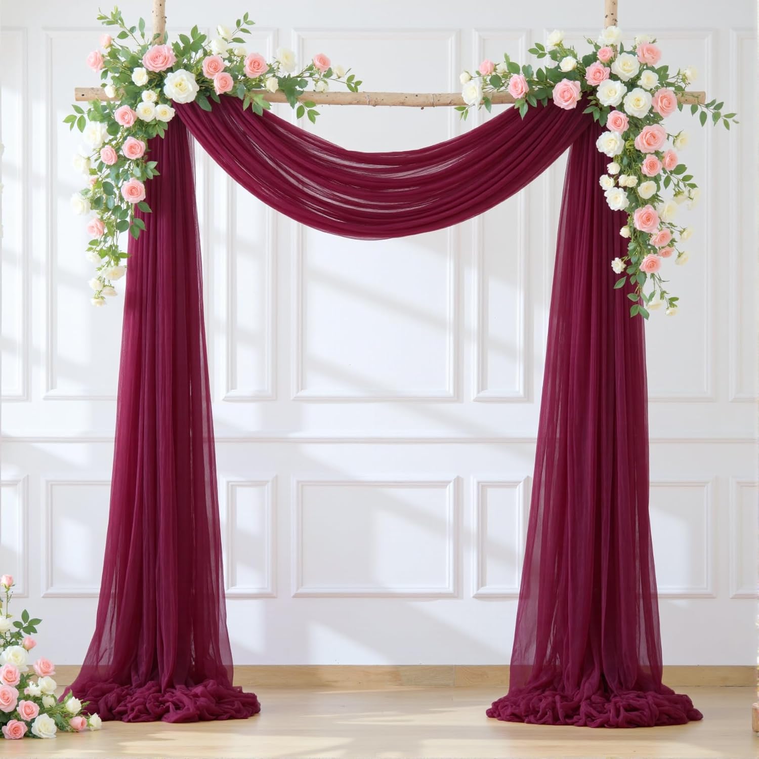 - Best Choice Wedding Arch: Package includes 2 panels burgundy wedding arch sheer drapes, each panel is 30 inches wide and 19 ft long. The drape of the fabric is perfect for use in a wedding arbor. These arch fabric add a pretty touch to pillars at a wedding.