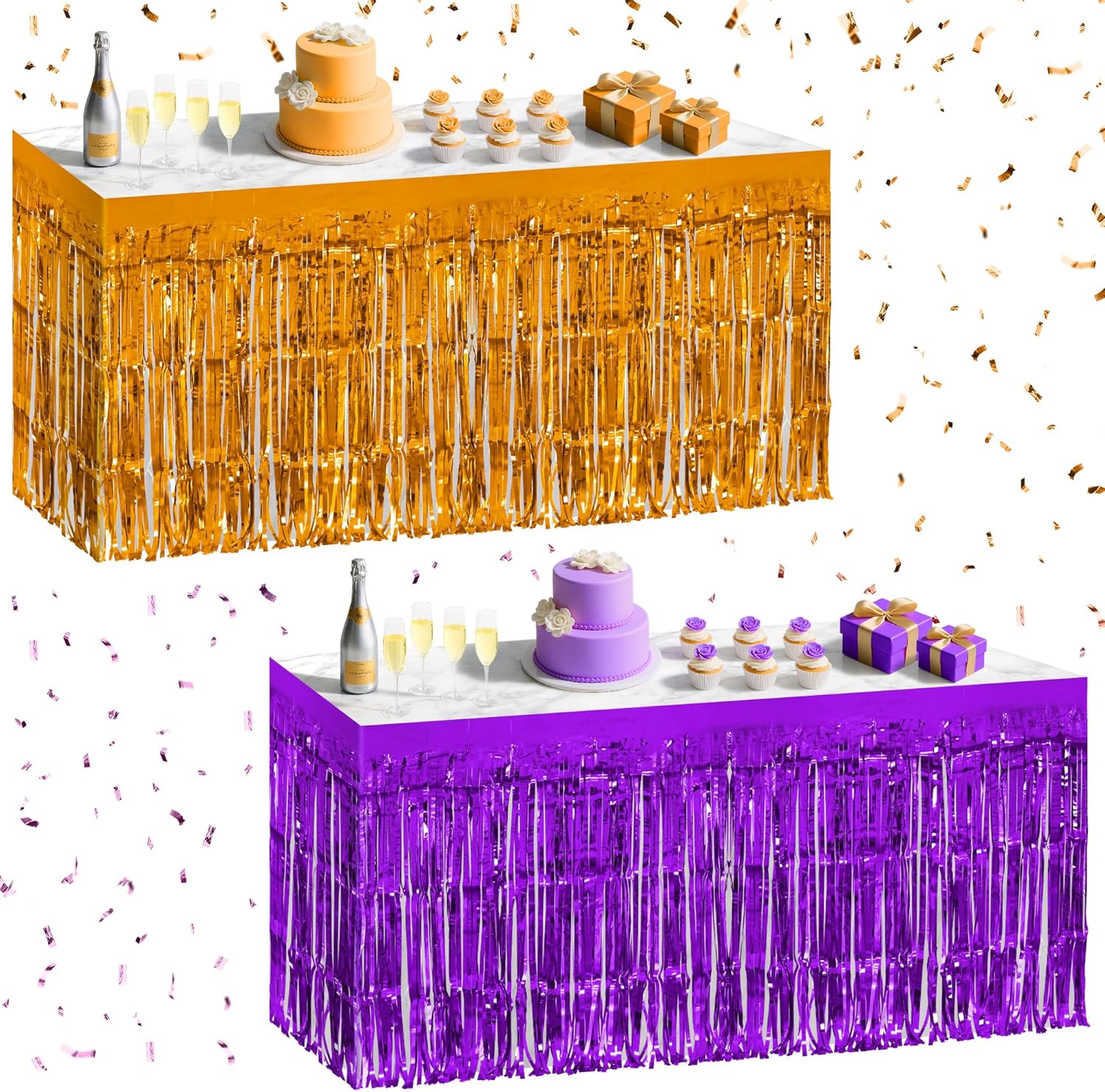 2 Pack Dark Purple Orange Table Skirts, 29x108" Metallic Foil Tinsel Fringe Table Skirt for Rectangle Tables Streamer Curtains Backdrop, Party Decorations for Birthdays, Weddings, Holidays