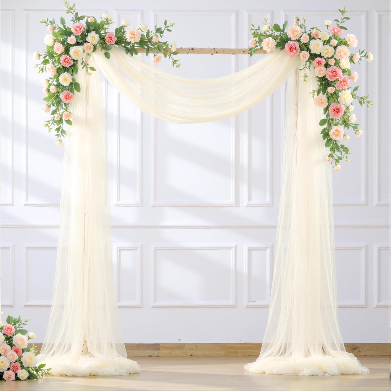 - Wedding Arch Draping Fabric: 100% high-grade polyester tulle, offering unmatched softness and durability. Delicate matte finish with a subtle sheen that catches light elegantly without glare (perfect for photography).Wrinkle-free: Packed on roll with anti-crease lining—unfurls ready-to-use.
