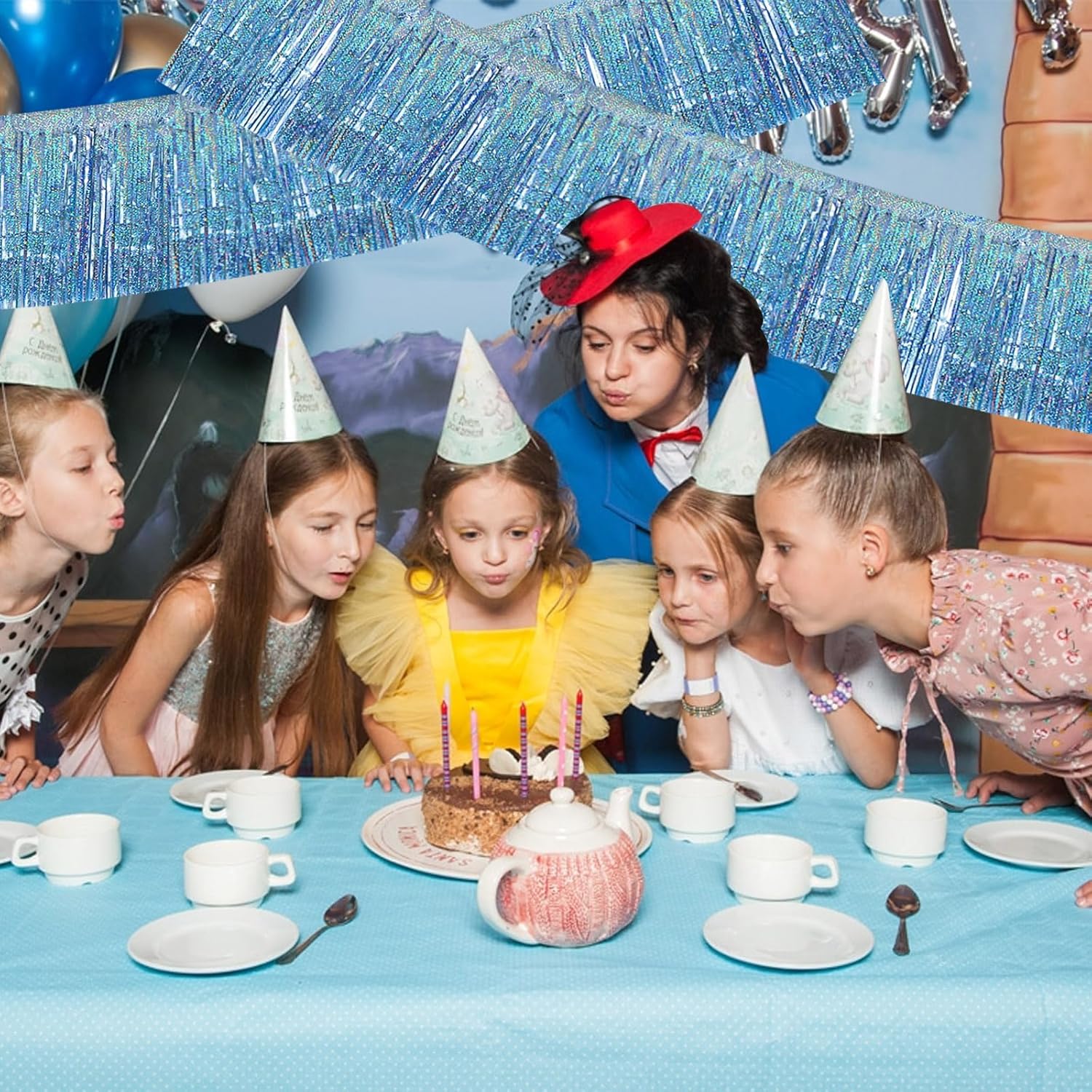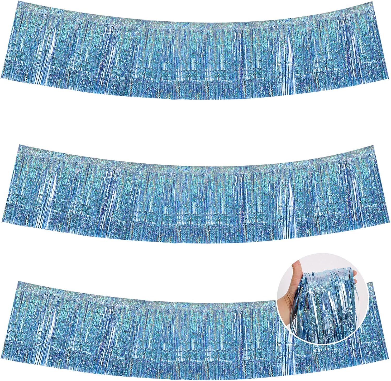 BEISHIDA 3 Packs Metallic Foil Fringe Garland Laser Light Blue Wall Hanging Tinsel Fringe Banners for Car Floats Bridal Shower Wedding Birthday Easter Graduation Holiday Party Decoration(30 Feet)