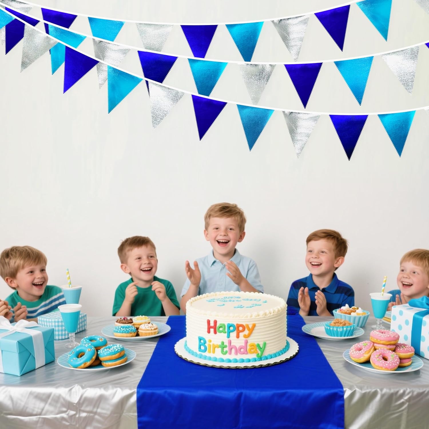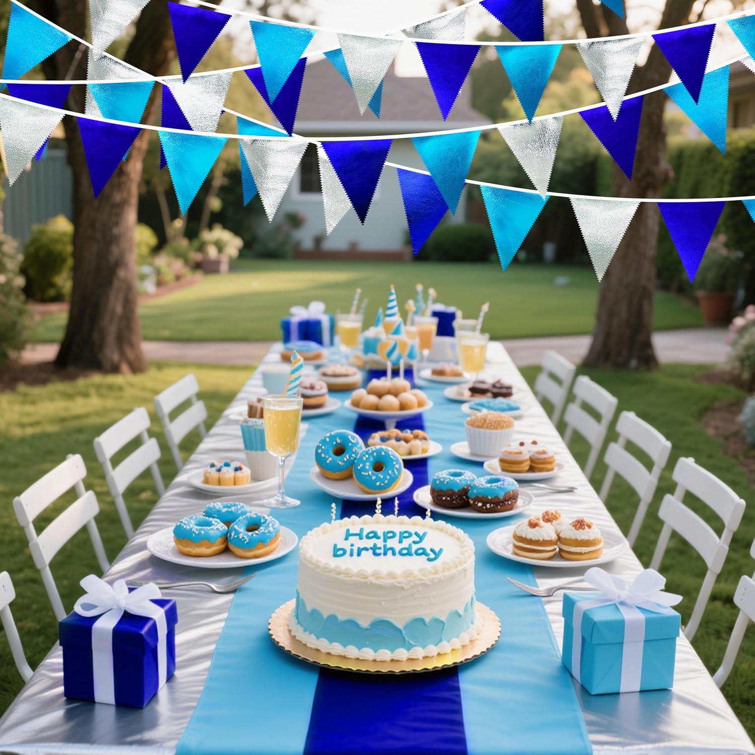 - Environmental Material - Our triangle flag banner bunting are made of double-sided sky bluećroyal bluećsilve metallic fabric cloth,Unique wavy neat cut,soft and comfortable touch.safe and odorless,washable and waterproof,durable and reusable.