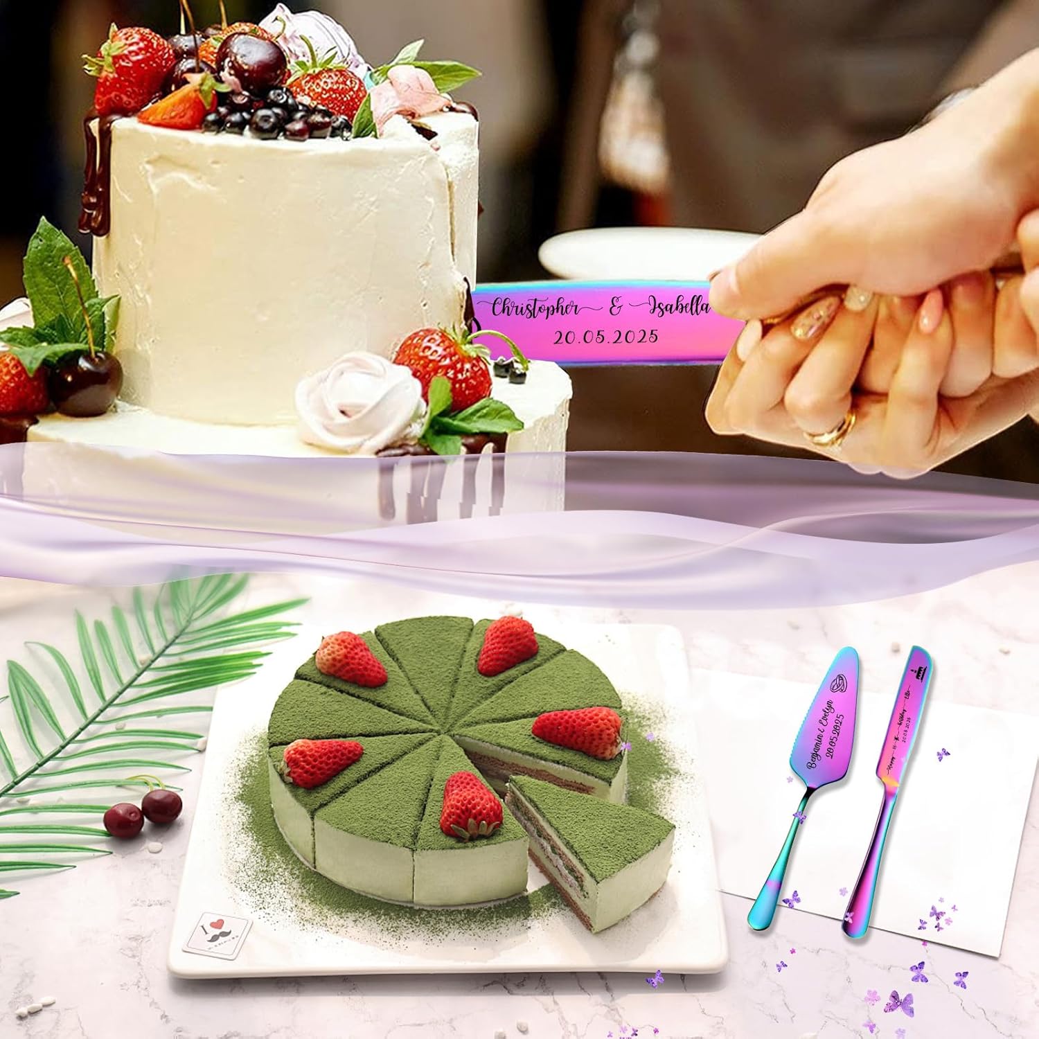 - Personalized Wedding Cake Knife and Server Set:Our wedding cake cutting set features personalized design as the core highlight, injecting a unique romantic imprint into your wedding! Using laser engraving technology, you can engrave the names of the bride and groom, wedding date, or exclusive love motto on the cake knife and server set, making the tableware an "exclusive token" that carries emotions