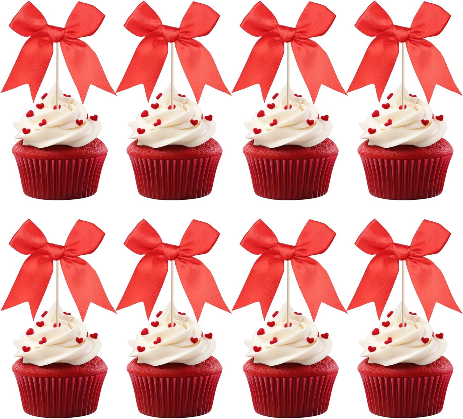 24 PCS Bow Cupcake Toppers Bowknot Cake Toppers Bow Cupcake Picks Bowknot Birthday Party Decorations Bow Cake Dessert Picks for Wedding Bridal Engagement Baby Shower Birthday Party Supplies Red