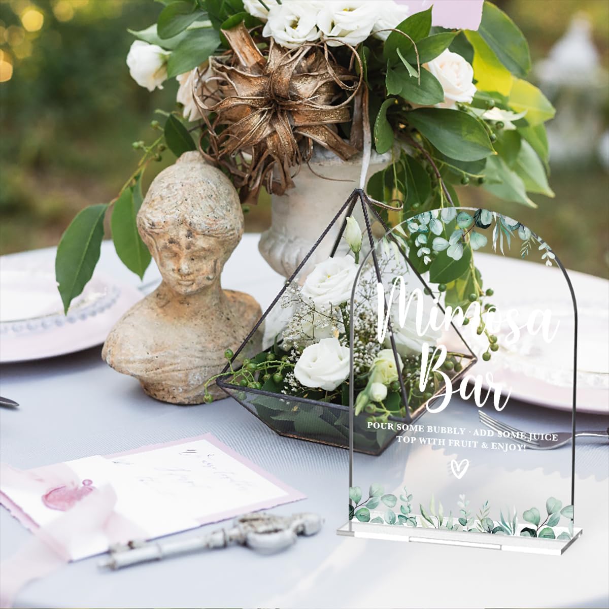 Acrylic Wedding Signs, Bridal Shower Decorations, Mimosa Bar Signs for Reception, Modern Calligraphy Arch Acrylic Table Top Sign for Wedding Reception and Engagement Parties (Clear Eucalyptus Leaves)