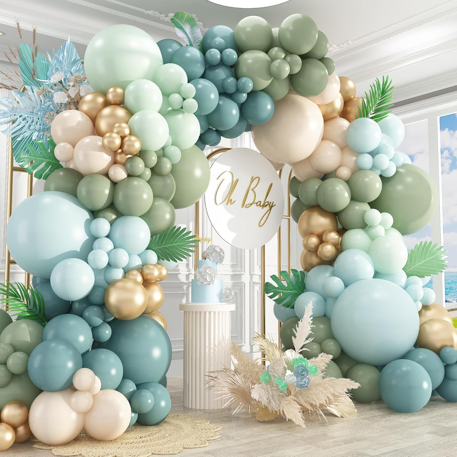 - Package List :Blue and Green Balloon Arch Kit includes 18" dusty blue/pastel green/sage green/Sand White balloons(12 pcs), 12" dusty blue/sage green/pastel blue/pastel green /sand white/metallic gold balloons(100 pcs), 10" dusty blue/sage green/pastel blue/pastel green /sand white/metallic gold balloons(100 pcs), 5" dusty blue/sage green/pastel blue/pastel green /sand white/metallic gold balloons(100pcs),glue dotsx200, ribbonx2, decorative stripx2. plenty in quantity, Perfect for creating jungle woodland theme party and sage green balloons party