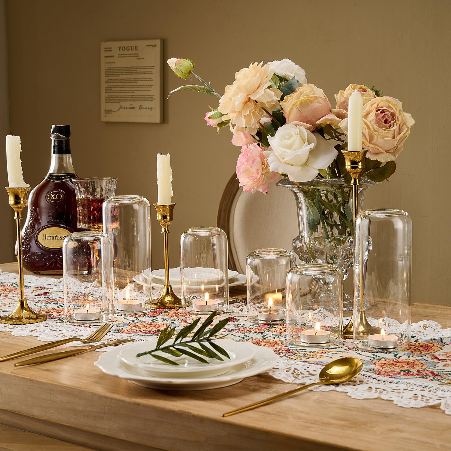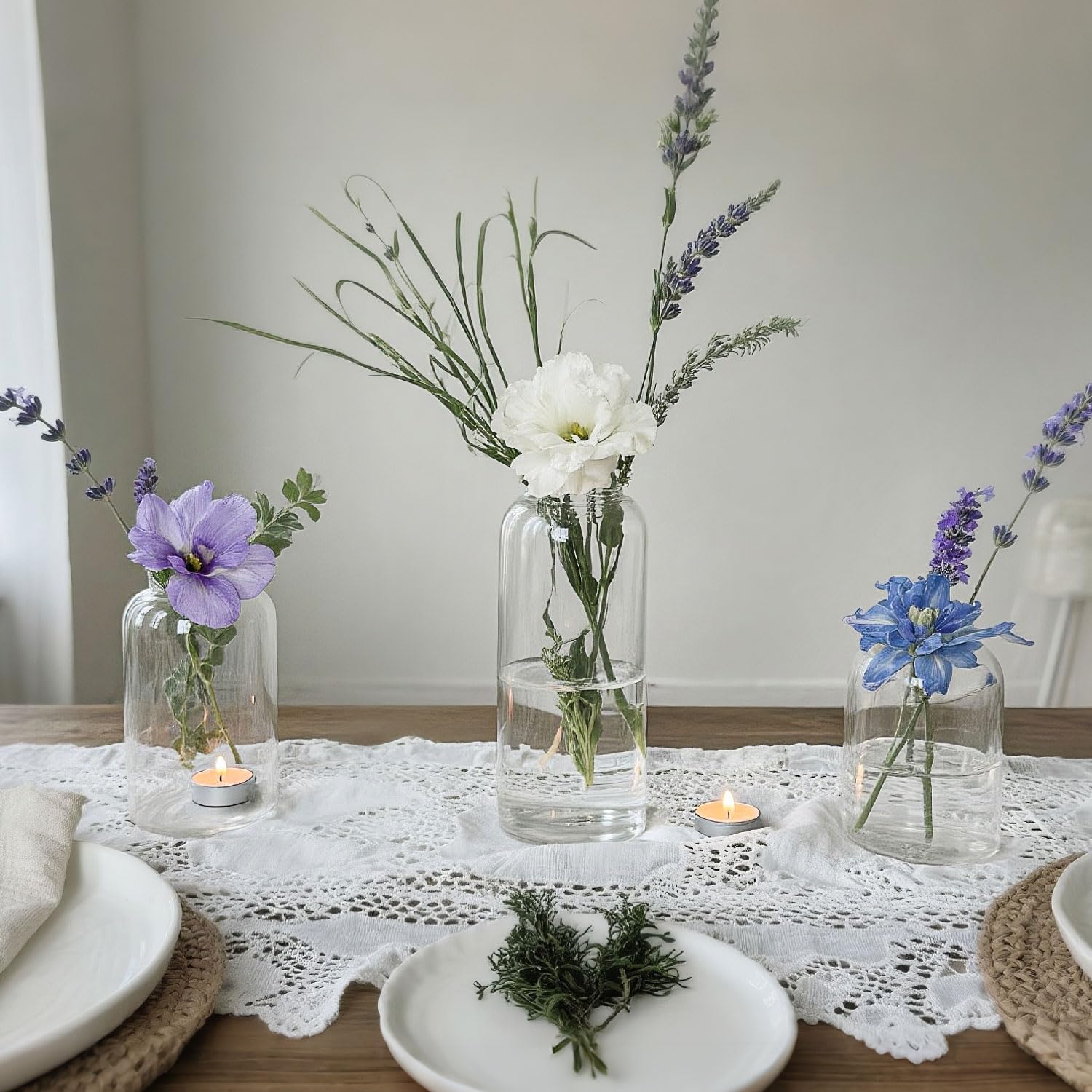 - Multi-Functional Vase Set: This set includes 3 cylindrical narrow-necked glass vases in varying heights (3.9'', 4.9'', 6.7''), each with a body diameter of 2.75‘’ and a neck opening of 1.6‘’. Designed for versatility, they effortlessly adapt to: Floral arrangements (fresh or dried stems) Succulent planting (miniature greenery displays) Floating candle holders (create ambient lighting) Decorative displays (shells, gemstones, or curated collections)