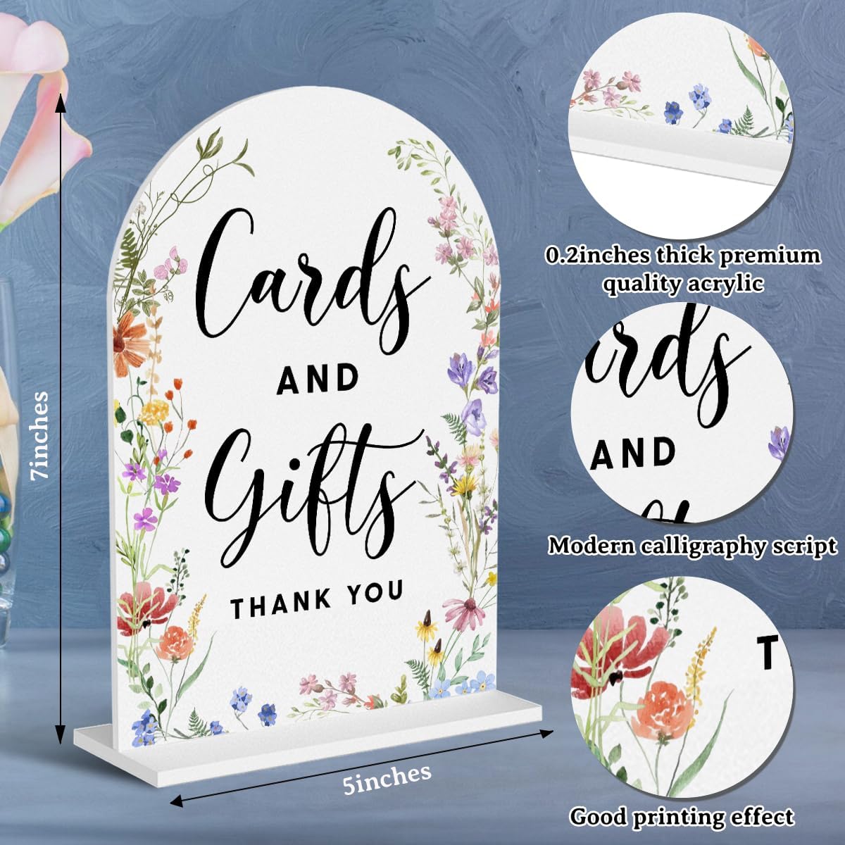 Acrylic Wedding Signs, Cards and Gifts Signs for Marriage Reception, Bridal Shower Decorations, Modern Arched Round Top Acrylic Table Top Sign with Holder for Wedding Party Dinner (White Wildflowers)