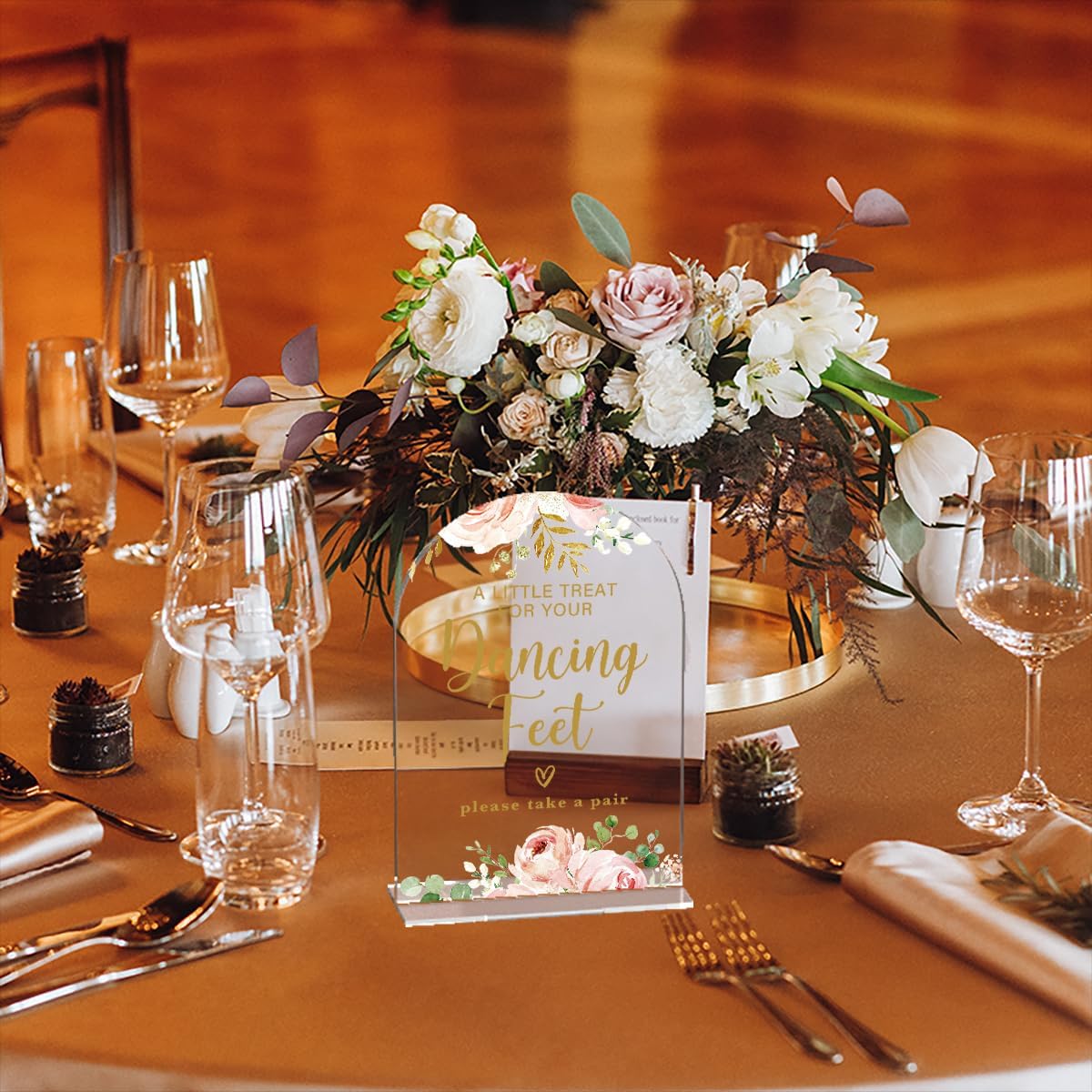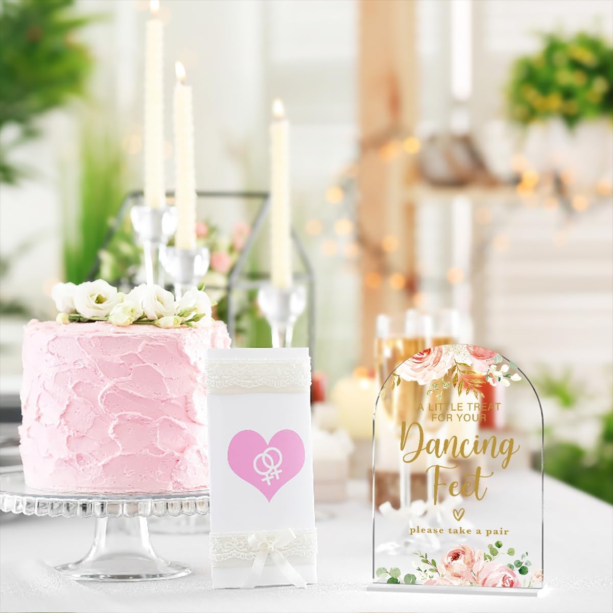 Acrylic Wedding Signs, Bridal Shower Decorations, Dancing Feet Signs for Reception, Modern Calligraphy Arch Acrylic Table Top Sign for Wedding Reception and Engagement Parties (Clear Pink Flowers)