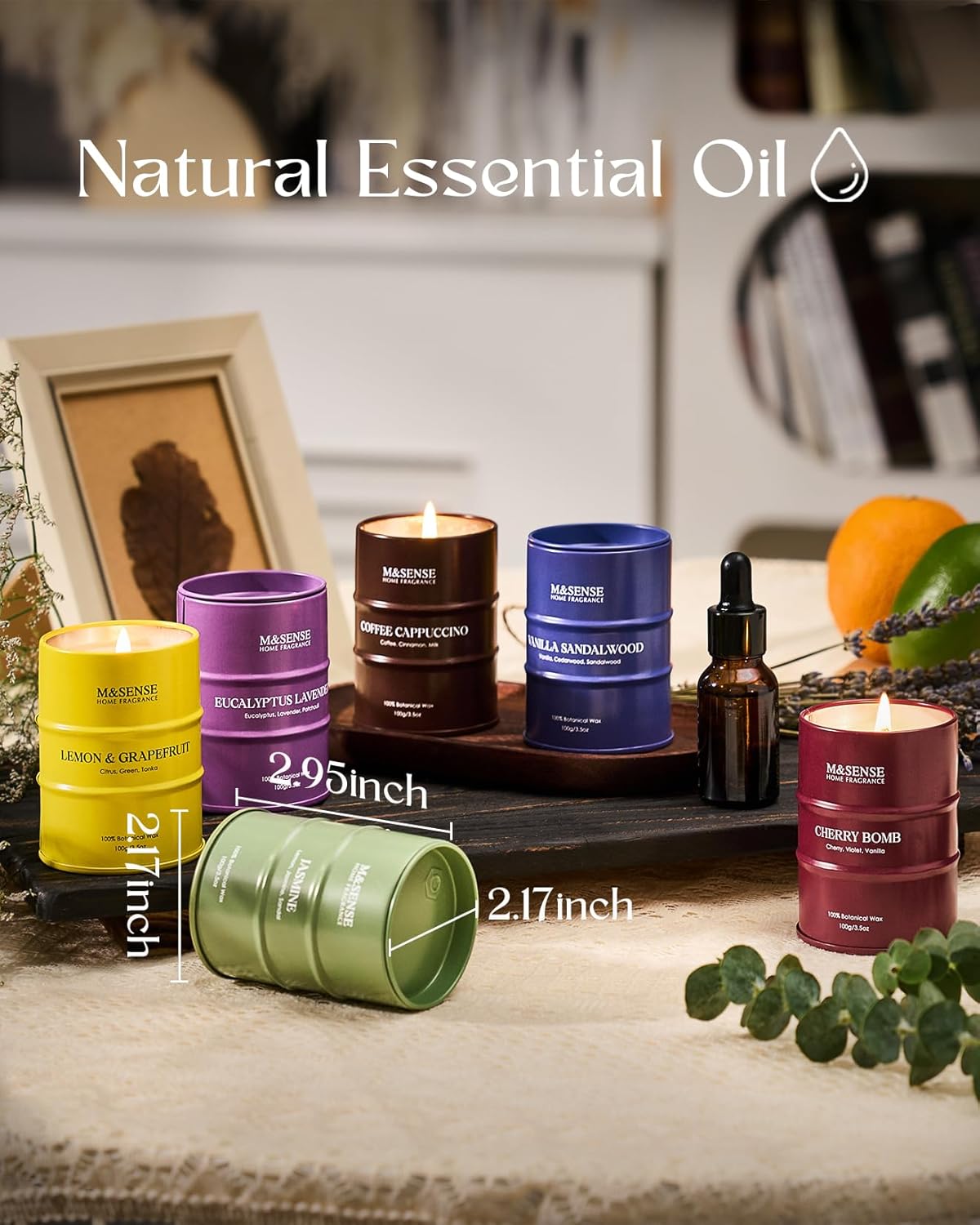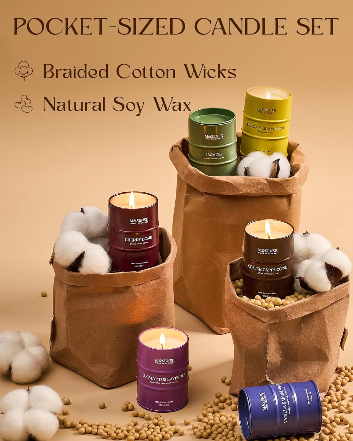 - 💚 Sustainable Material - M&SENSE candles are all crafted with the finest and most natural ingredients. Using high-end vegetable wax and unbleached cotton wicks in a reusable and recyclable tin. Packaged in recycled honeycomb paper and cardboard box for a more sustainable future.