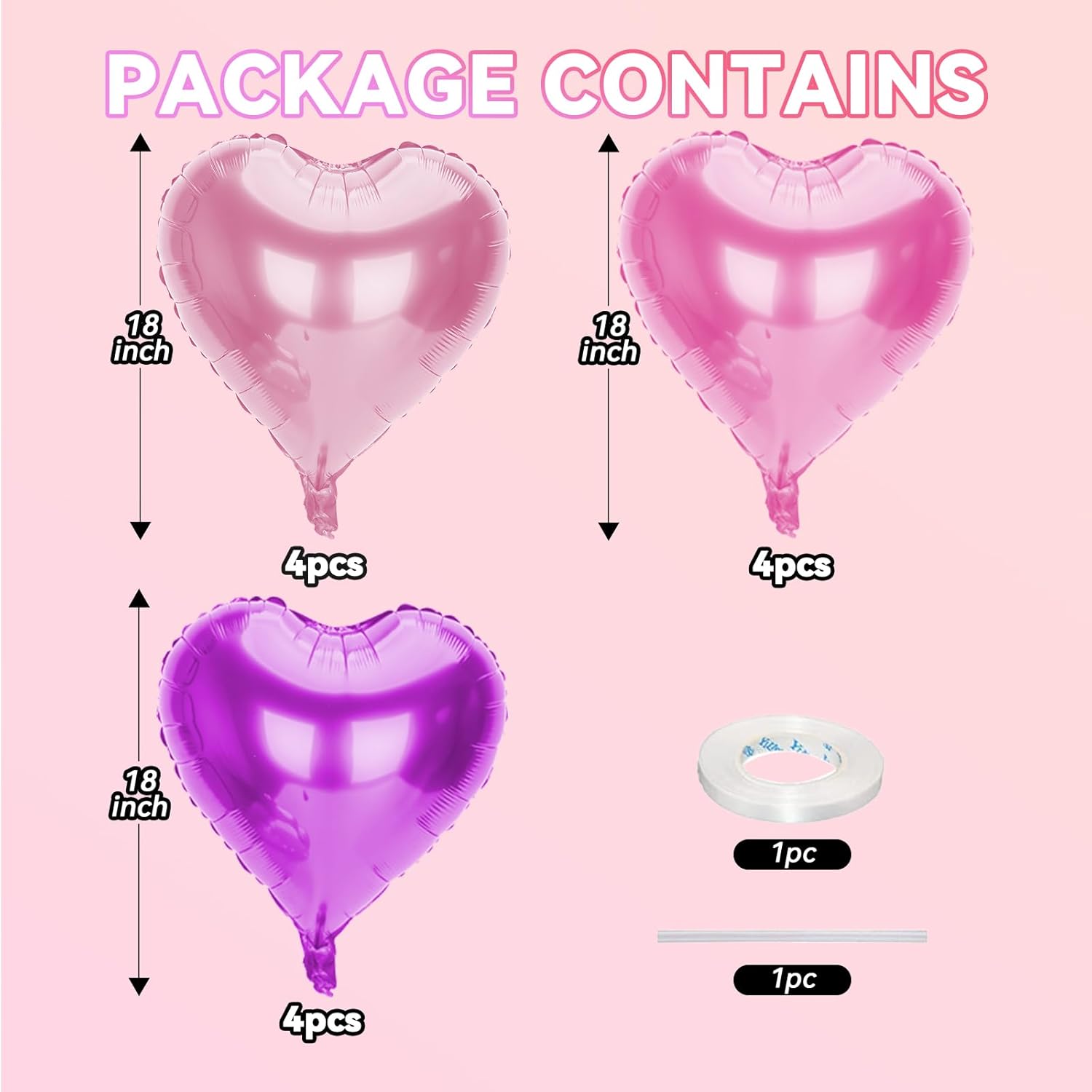 - Pink Heart Balloons:This 18 inches heart shaped balloons includes 4* hot pink heart balloons, 4* pearl pink heart balloons, 4* purple heart balloons, 1* ribbon, 1*straw, adding romance and warmth to your celebration. These large heart balloons will be the highlight of your party decorations, creating an atmosphere of love for everyone.