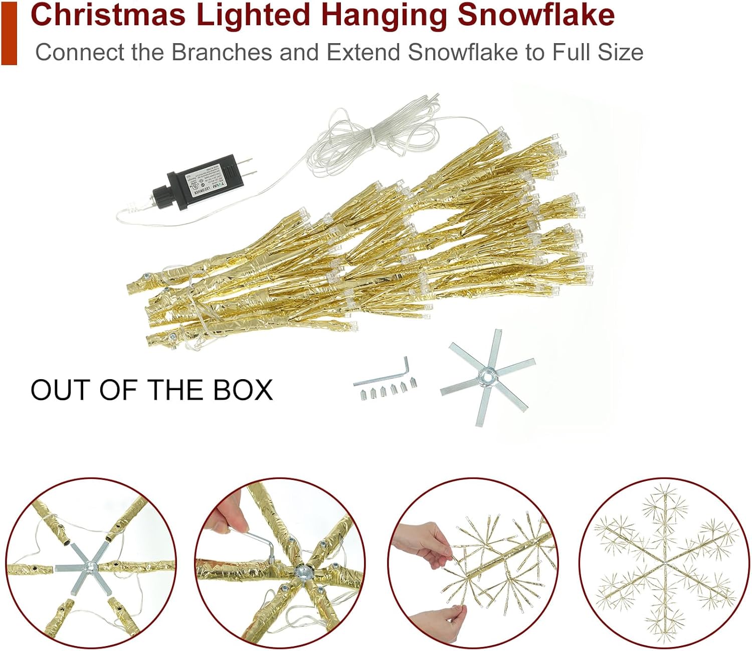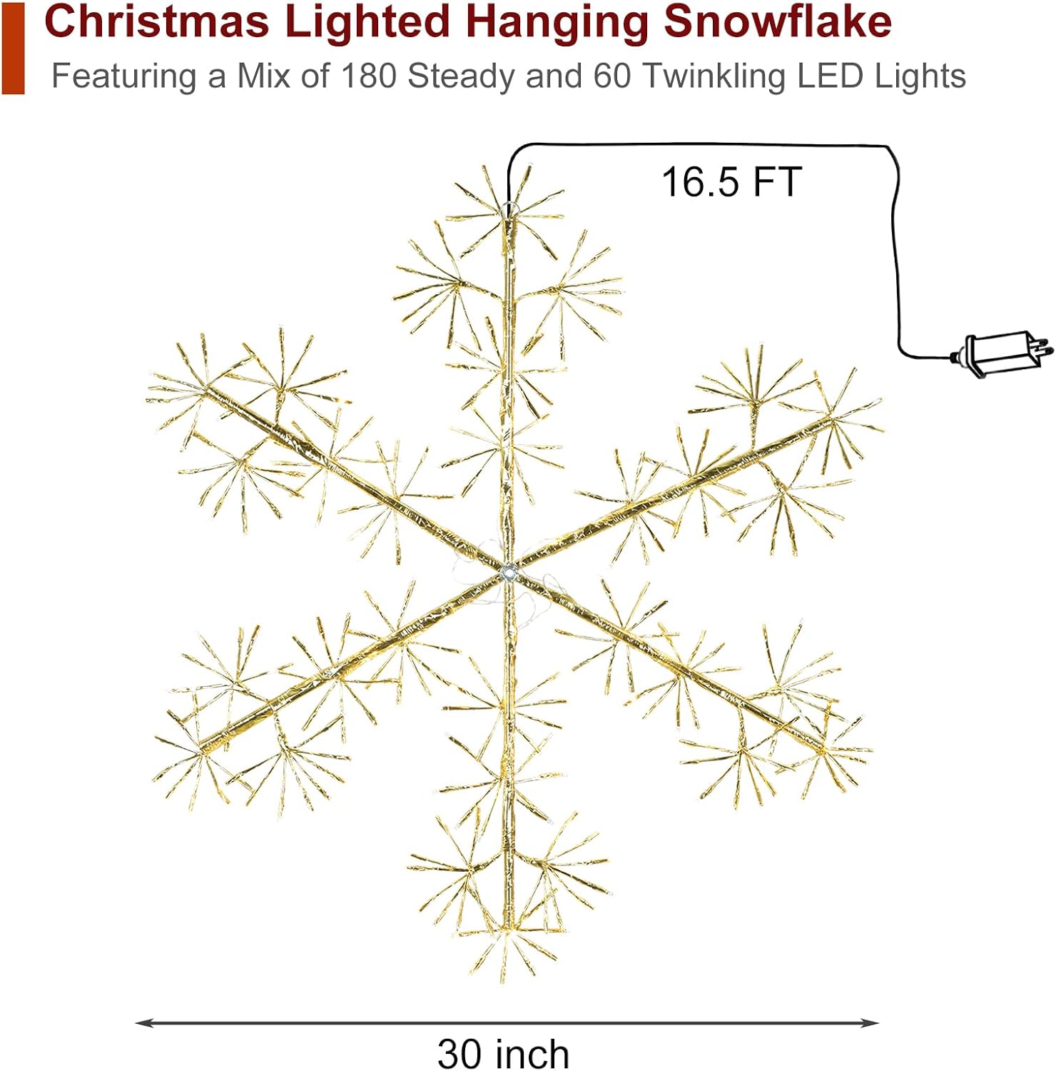 30’’ Christmas Snowflake Lights Outdoor, Pre-lit 240Pcs Warm White LEDs Hanging Golden Snowflake Decoration for Home Indoor Outdoor Window Silhouette