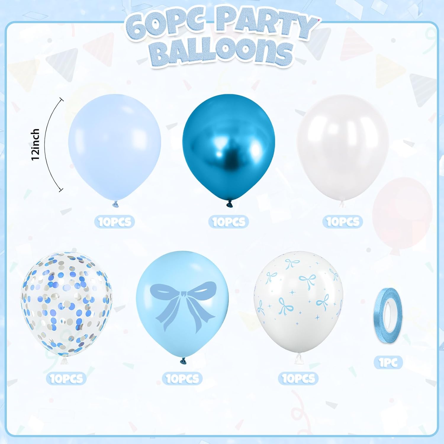 - All-in-One Set: This pastel blue bow balloons kit includes 30pcs 12inch latex balloons(pearl white, metallic blue, macaron blue), 10pcs blue silver confetti balloons, 20pcs bow print balloons(big bow print, small bow print), and 1pc silver ribbon. Whether it’s a birthday bash or bridal shower, the thoughtful color combo, suitable for adding a fun, modern touch to any celebration.