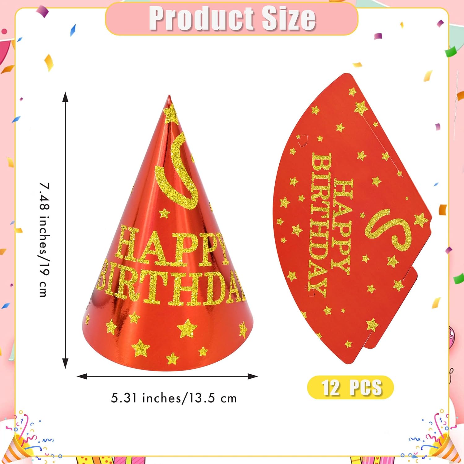 - π[One Size Fits Most] Height: 7.48 inches/19 cm. Diameter: 5.3 inches/13.5 cm. Birthday hats adults come with 12 elastic strings to freely adjust the size, suitable for most adults and children.