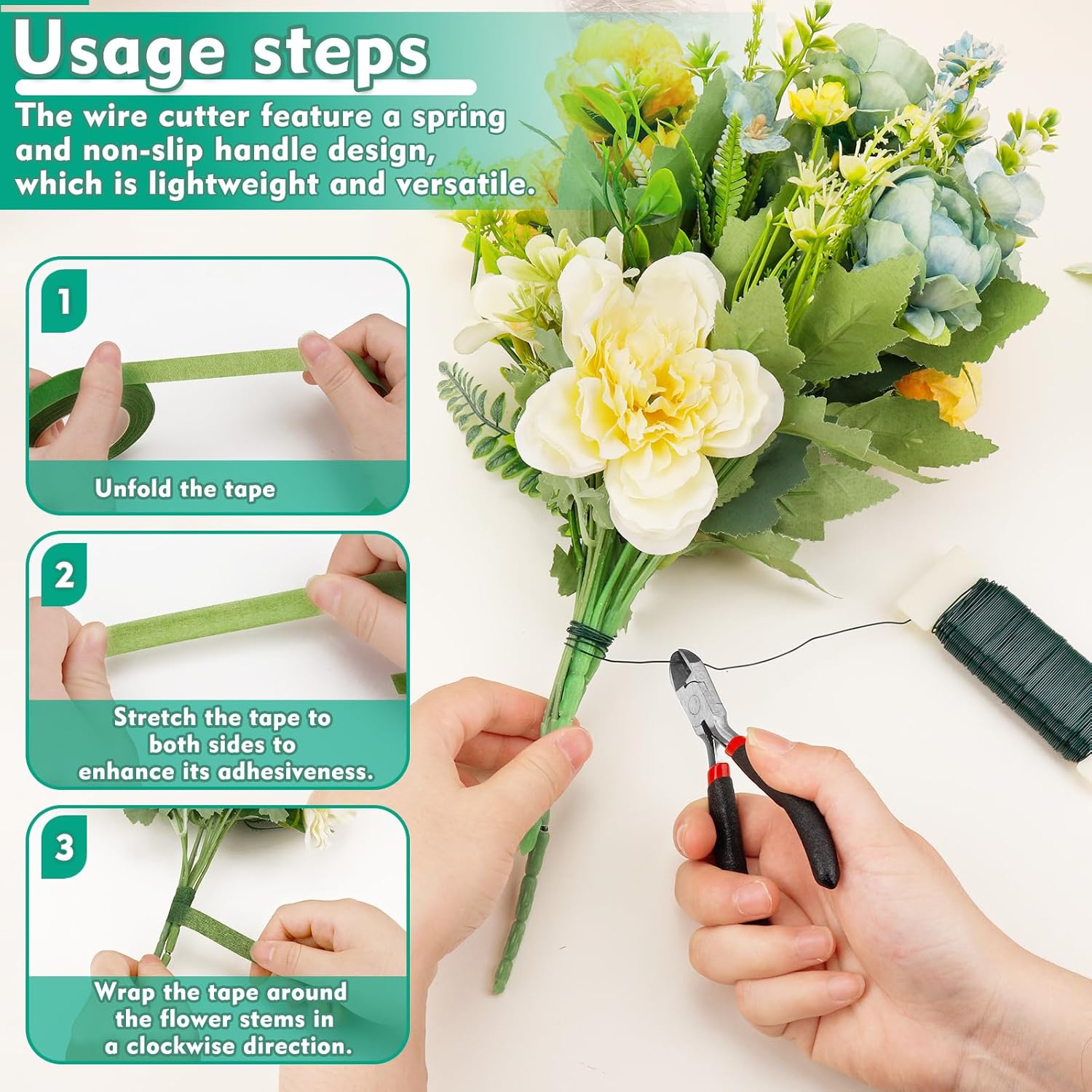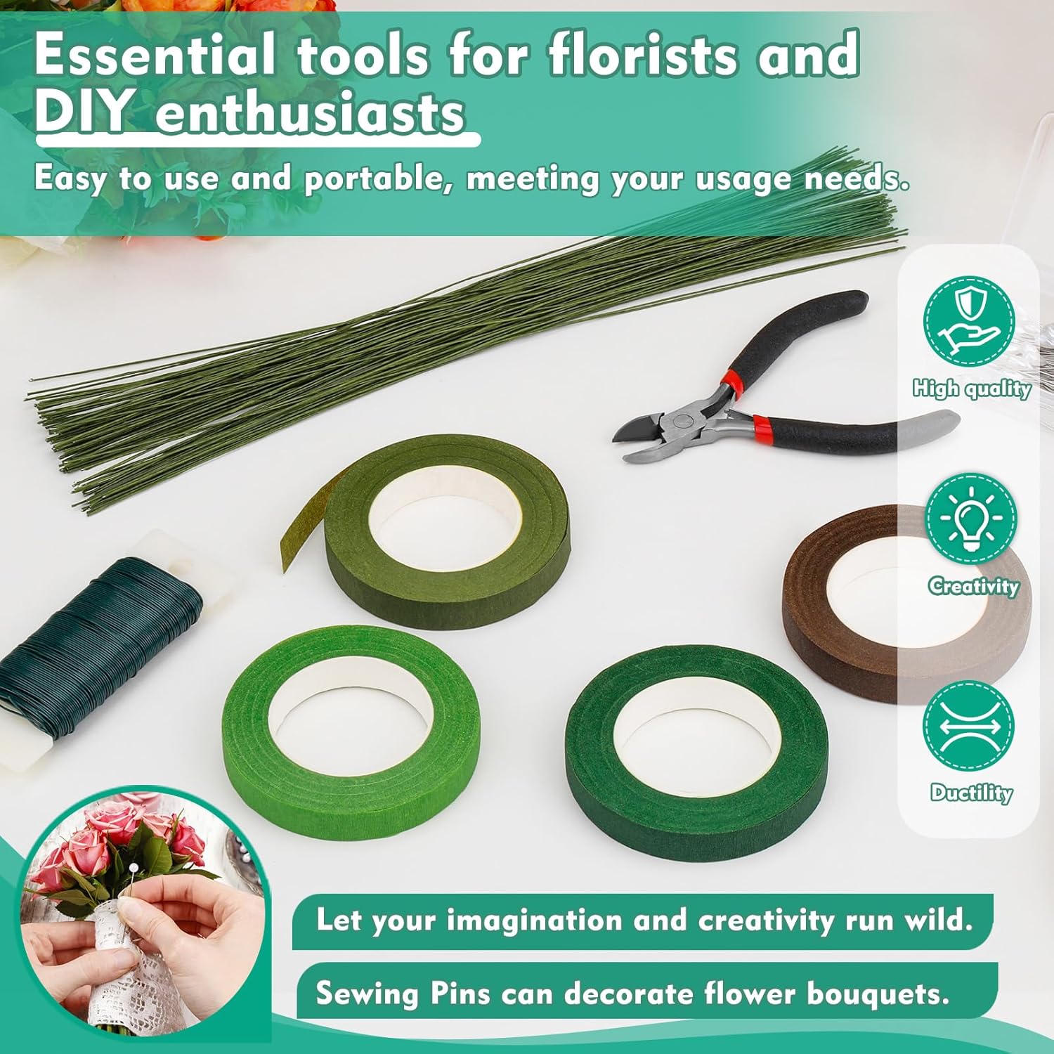 - Complete Floral Arrangement Kit: 100 pieces of green stem wire 26 gauge, 115 feet green paddle wire 22 gauge, 4 rolls of floral tape, 50pcs diamond pins, and 1 pair wire cutter. These wreath-making supplies are all you need for DIY flower arrangements, bouquets, boutonnieres, etc