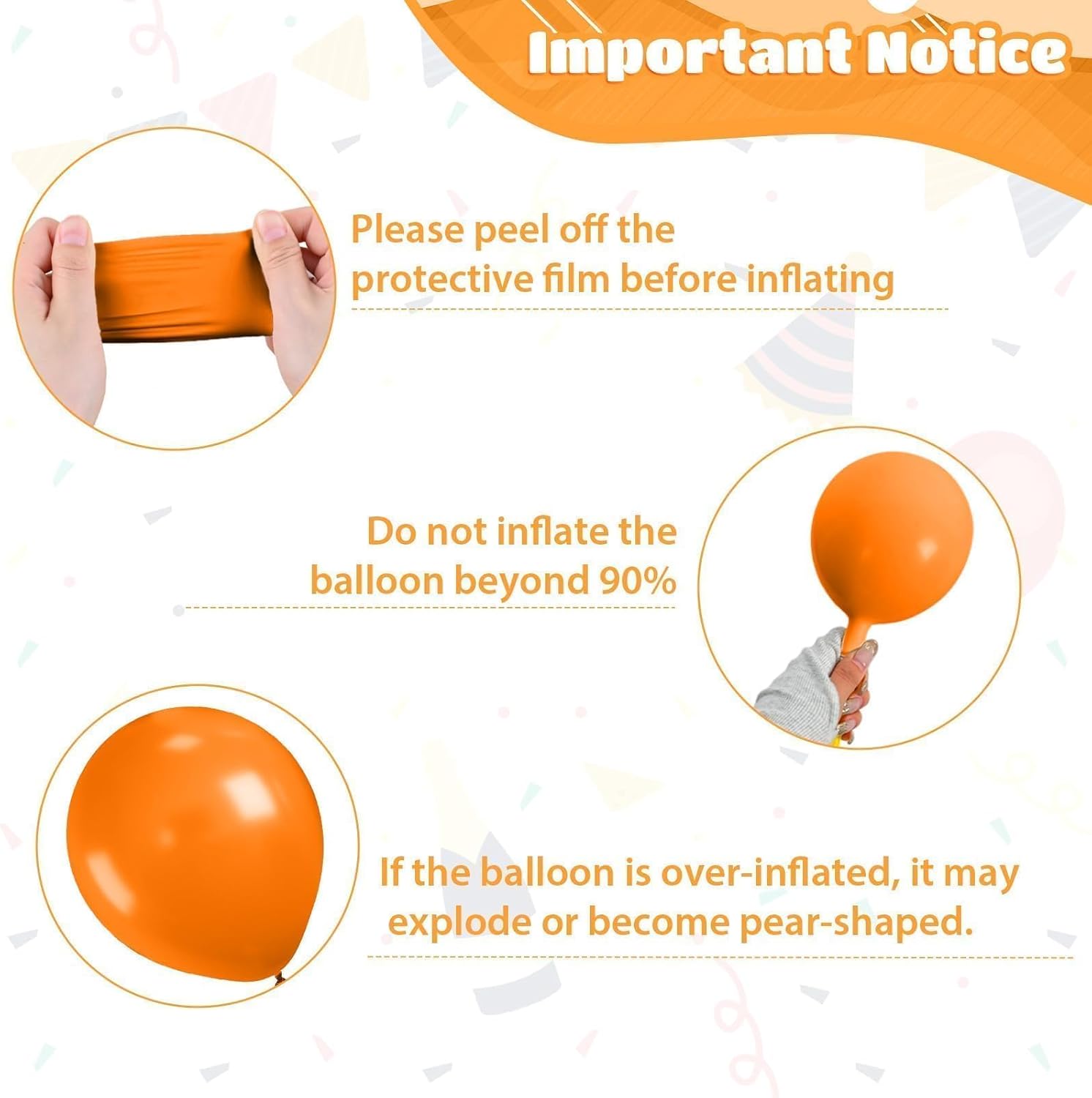 - ăTips for Safety & UseăInflate balloons to about 85% capacity to prevent breakage. Keep away from sharp objects and hot surfaces. These balloons should be used under adult supervisionâespecially around under 8. After use, discard deflated or broken pieces promptly. Use these neon party decorations indoors or outdoors for bold, festive energy
