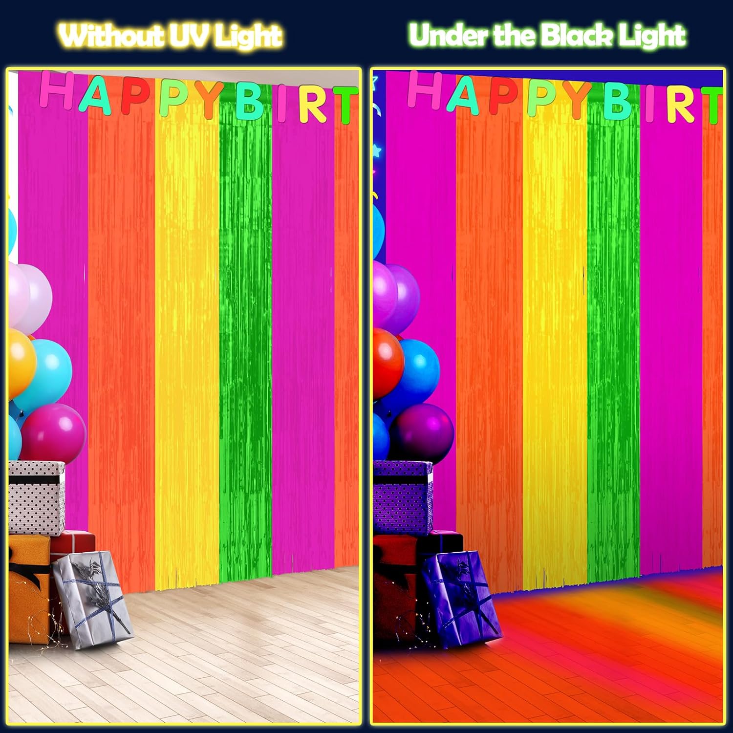 - What’s Inside: Included in the package are 4 glow in the dark foil fringe curtains in orange, yellow, hot pink and green colors, each measuring 3.3 x 6.6 ft, making them suitable for decorating most scenes. Perfect for creating an impressive neon backdrop for neon birthday party decorations and glow in the dark party supplies