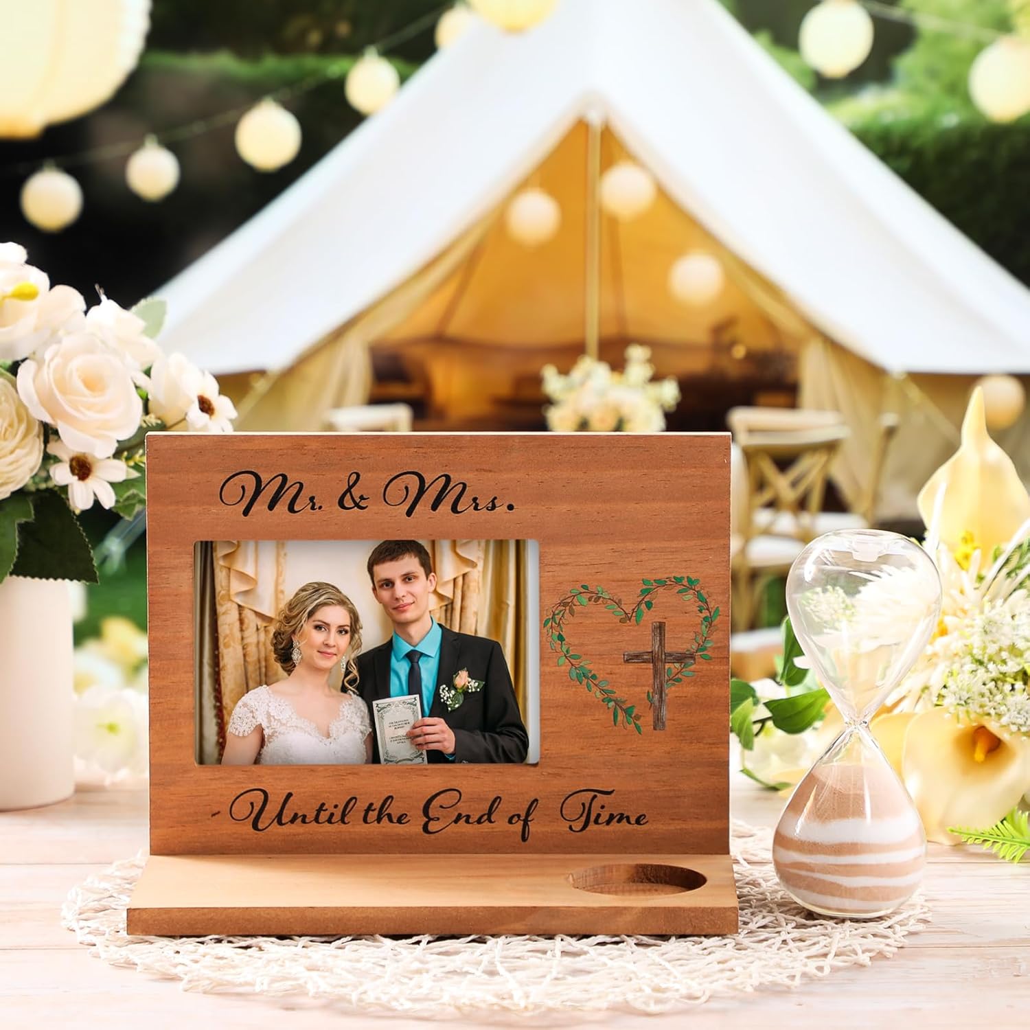 Blosssound Wedding Sand Ceremony Set Wooden Photo Frame, Hourglass Funnel, Sand, Glass Bottles, Mr and Mrs Until The End of Time Unity Kit for Weddings Ceremony Party Supplies(Nature)