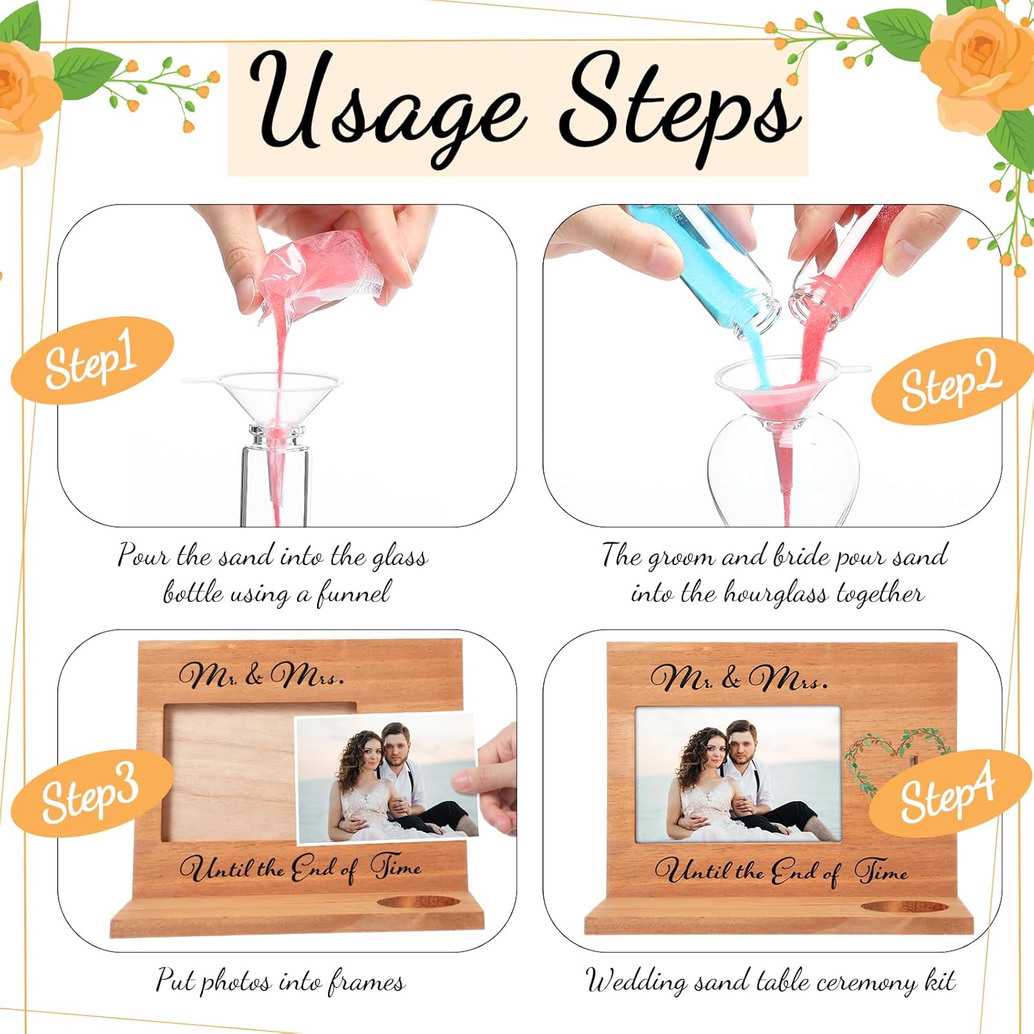 - Easy to Use: Our blended family wedding ceremony set is easy to use, you just need to put the wedding photos into the frame, and then at the beginning of the ceremony, you and your lover choose the color of sand you like and put it into the hourglass with a funnel. This moment represents the union of you and your lover and the formation of a new family
