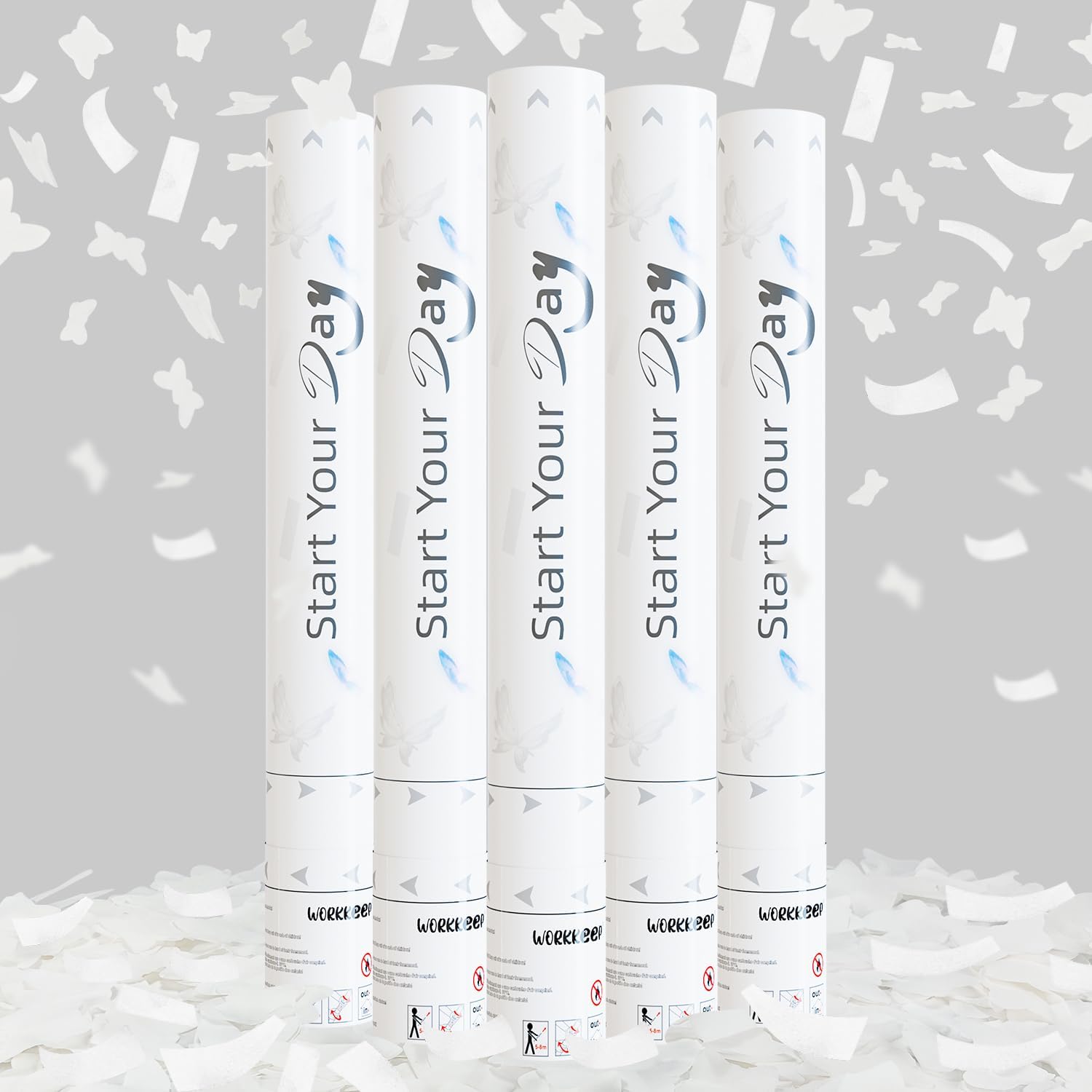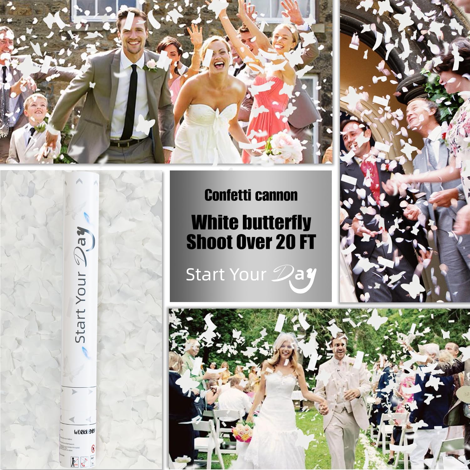- White Confetti Cannons: Start the party with a bang to add color to your celebration. Sprinkle everyone with white butterfly and strip-type paper confetti falling from the sky and let us make your party incredible.