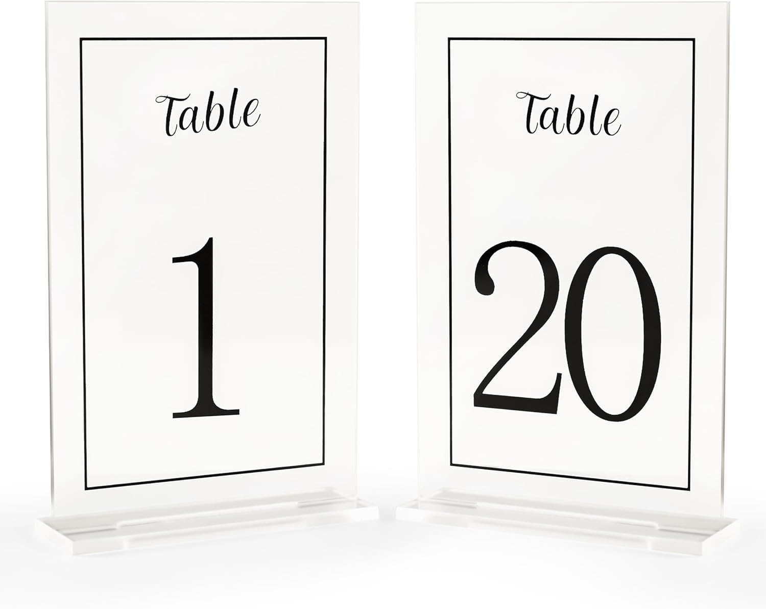 - [ACRYLIC TABLE NUMBERS] 4x6 inch transparent acrylic table numbers 1-20 with slim and stable base offer exquisite display with stunning calligraphy fonts easily visible on table with a touch of sophistication and elegance to grab the attention of your guests. They can easily spot their table even from far away. A timeless centerpiece decoration.