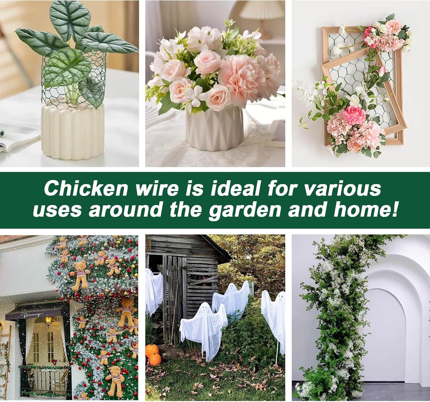 - 【Garden Protection & Home Decoration】Chicken Wire Mesh is widely used in our garden and house. In house decoration, it's ideal for creating photo walls, flower arrangement frames; in the garden, it's also perfect for making protective netting cover to protect small potted plants, plant climbing netting to provide strong support for climbing plants, and building Halloween decorative props.