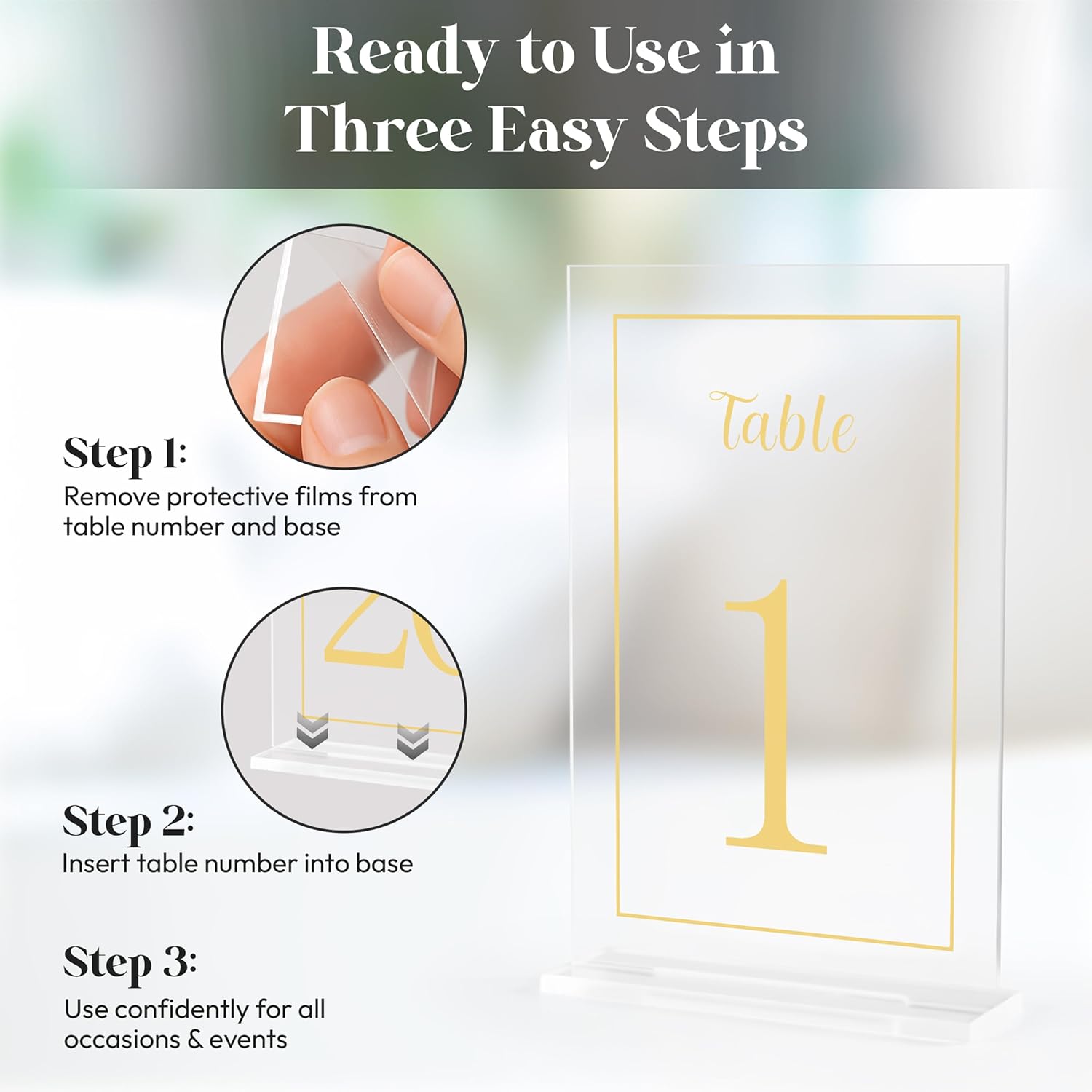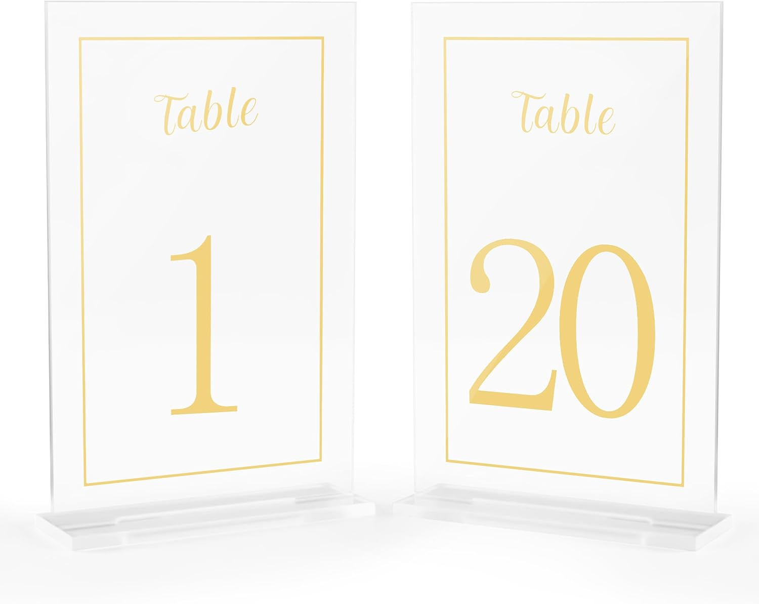 - [PREMIUM MATERIAL] These exquisite table numbers are beautifully designed in stunning shape with printed calligraphy and premium quality clear acrylic material. The slim and stable base offer superior stability. The table numbers and bases are covered with protective film to prevent scratching.