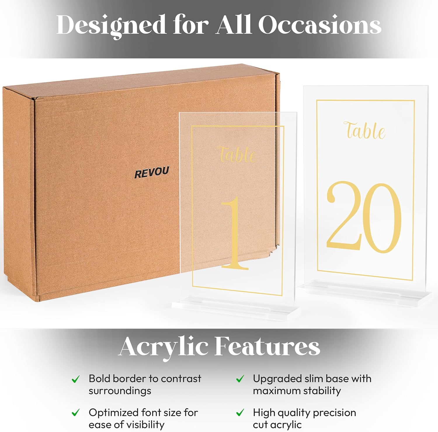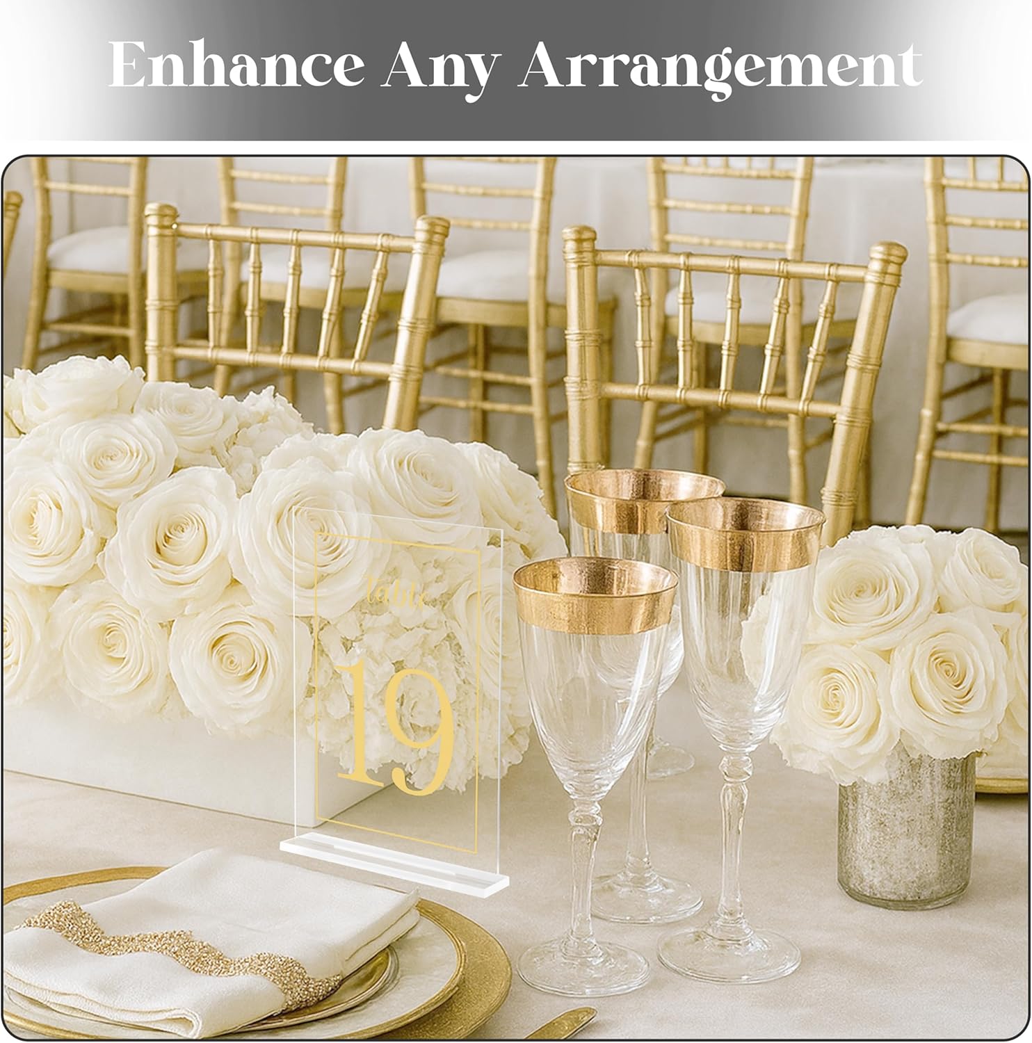 - [PACKAGE INCLUDES] Our acrylic table number package includes a pack of 20 stands with printed table numbers signs from 1 to 20. A perfect addition to your event and organization essentials with a timeless centerpiece decoration.