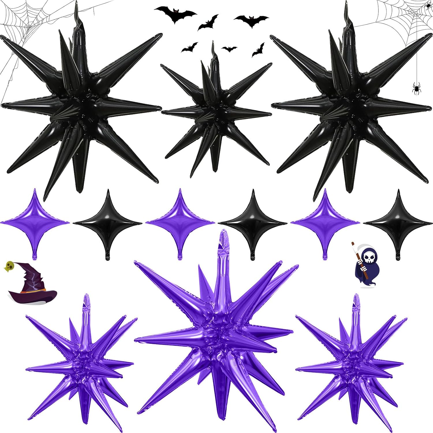 Purple Black Star Balloons 12pcs, 27/22 Inch Foil Star Explosion Balloons, Large Spike Mylar Cone Balloon, Fireworks Shape Balloon Decor for Birthday Halloween Wednesday Graduation