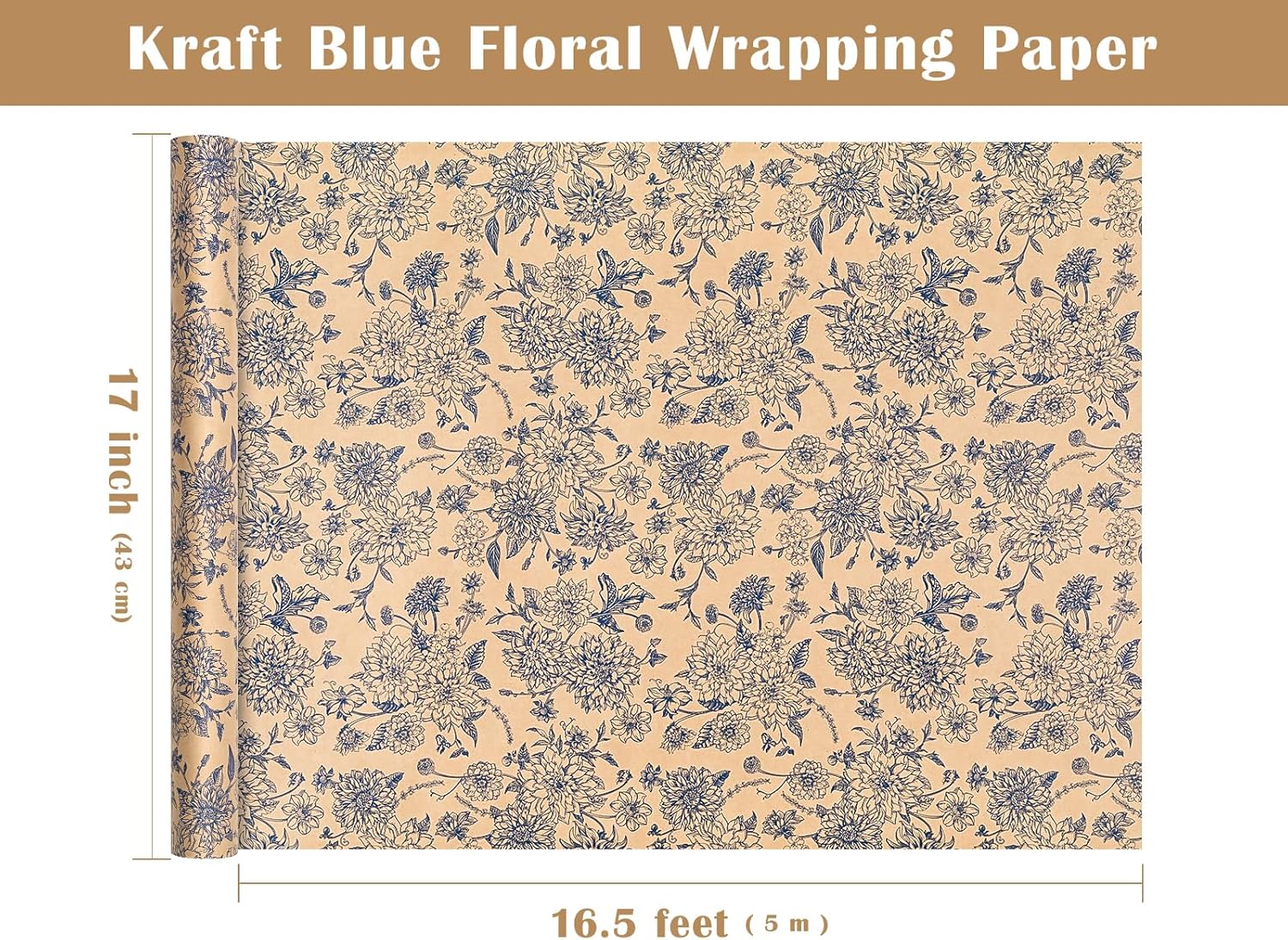 WRAPAHOLIC Kraft Blue Floral Wrapping Paper - Mini Roll - 17 Inch x 16.5 Feet - Vintage Blue Toile De Jouy Flower Wrapping Paper Perfect for Wedding, Birthday, Bridal Shower, Tea Party