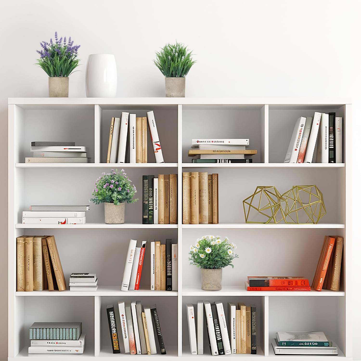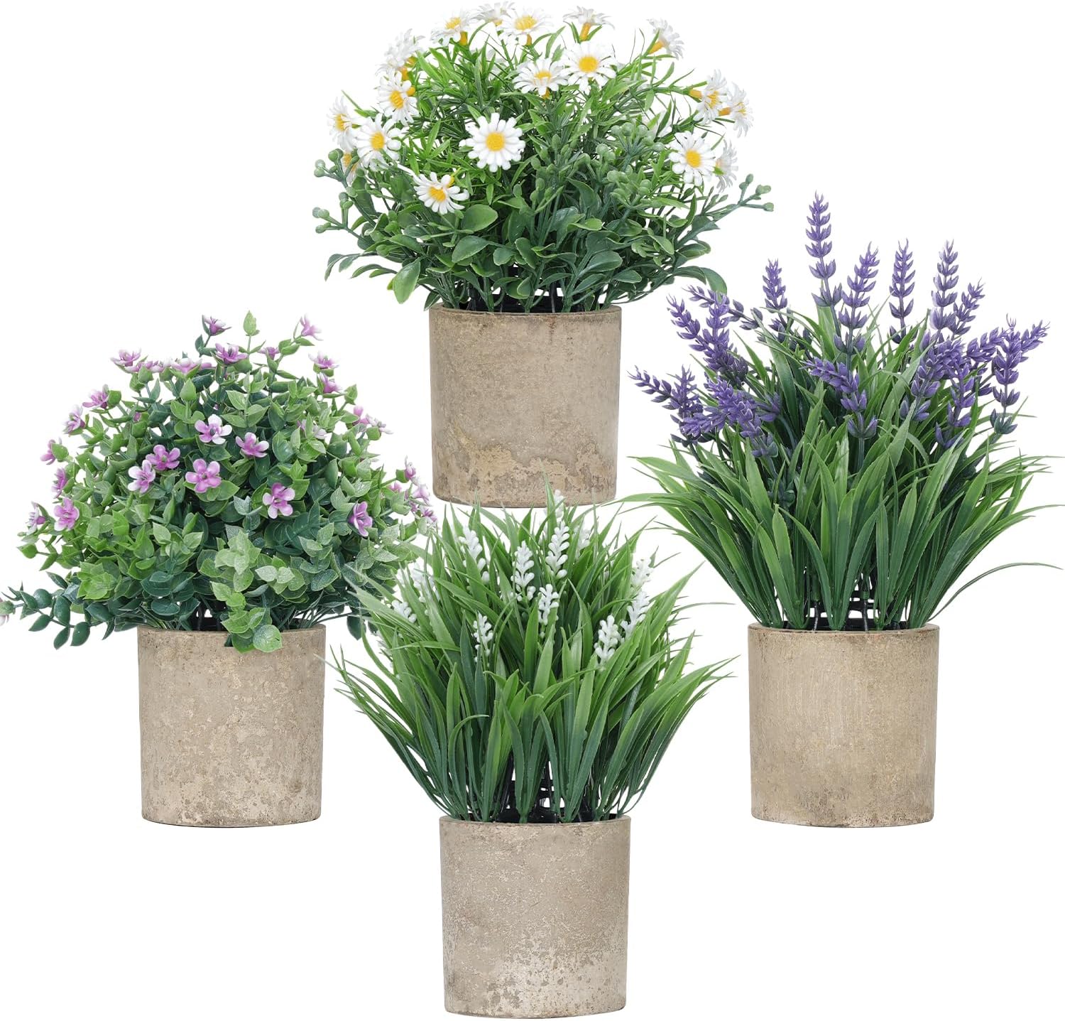 - Small Size & Adjustable Shape: This set includes 4 small artificial plants: a eucalyptus plant with flowers, a purple lavender, a white lavender, and a white daisy. The purple lavender measures 10.6 inches in total height, while the other three plants stand approximately 9 inches tall (from the top of the plant to the bottom of the pot). All plants span about 5.9 inches in width when the leaves are fully spread. The gray paper pulp pots are about 2.95 inches wide and 3.1 inches tall. You can gently adjust the leaves to achieve your desired shape and fullness. NOTE: The leaves may be slightly compressed during shipping β simply reshape