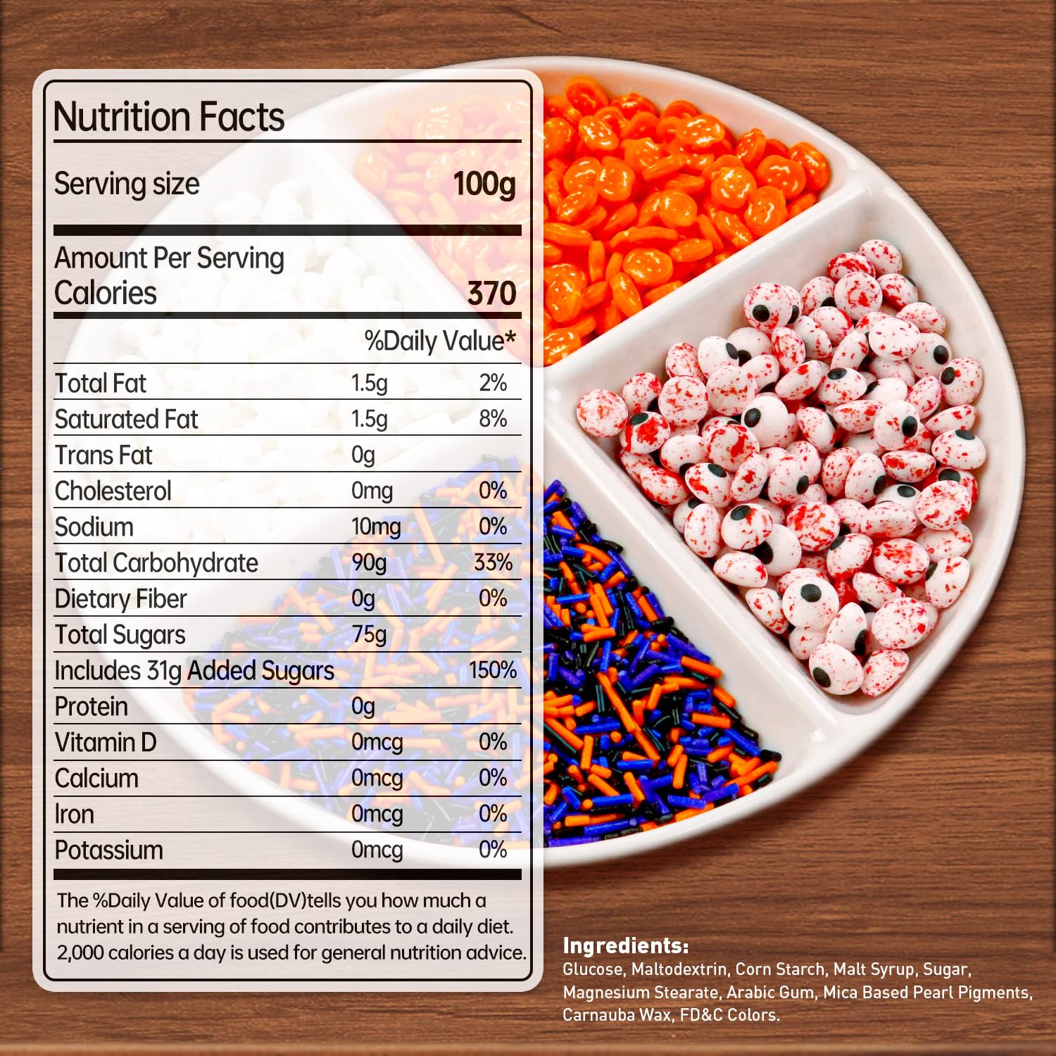 - [Food grade Halloween Sprinkles] This edible Halloween sprinkle are no gluten, no nut, no preservative, no dairy, no chemical, no GMO, low calorie, safe and healthy, suitable for different age costomers including little kids and even elderly people.