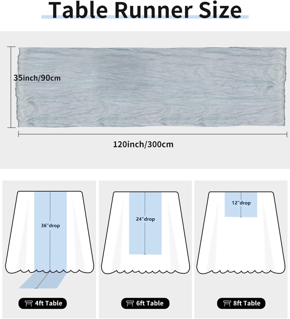 - Package : 1 dusty blue cheesecloth table runner (35β W x 120β L / 10 FT). Perfect for 6ft/8ft round or rectangular tables seating 8-10 people; can be used for long tables. It's also a great choice for decorating wedding arches and chairs.